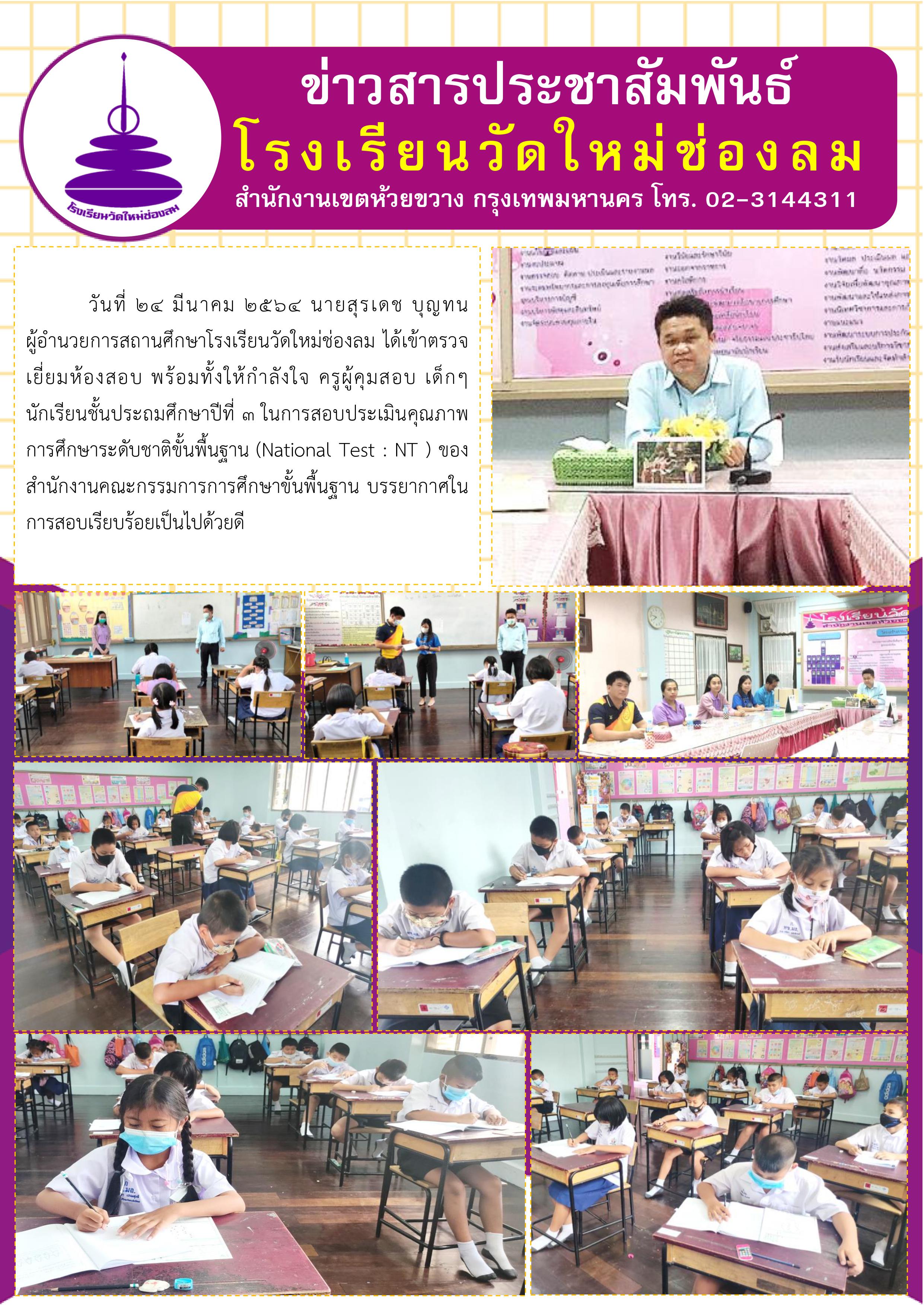 วันที่ 24 มีนาคม 2564 นายสุรเดช บุญทน ผู้อำนวยการสถานศึกษาโรงเรียนวัดใหม่ช่องลม ได้เข้าตรวจเยี่ยมห้องสอบ พร้อมทั้งให้กำลังใจ ครูผู้คุมสอบ เด็กๆ นักเรียนชั้นประถมศึกษาปีที่ 3 ในการสอบประเมินคุณภาพการศึกษาระดับชาติขั้นพื้นฐาน (National Test : NT ) ของสำนักงานคณะกรรมการการศึกษาขั้นพื้นฐาน บรรยากาศในการสอบเรียบร้อยเป็นไปด้วยดี