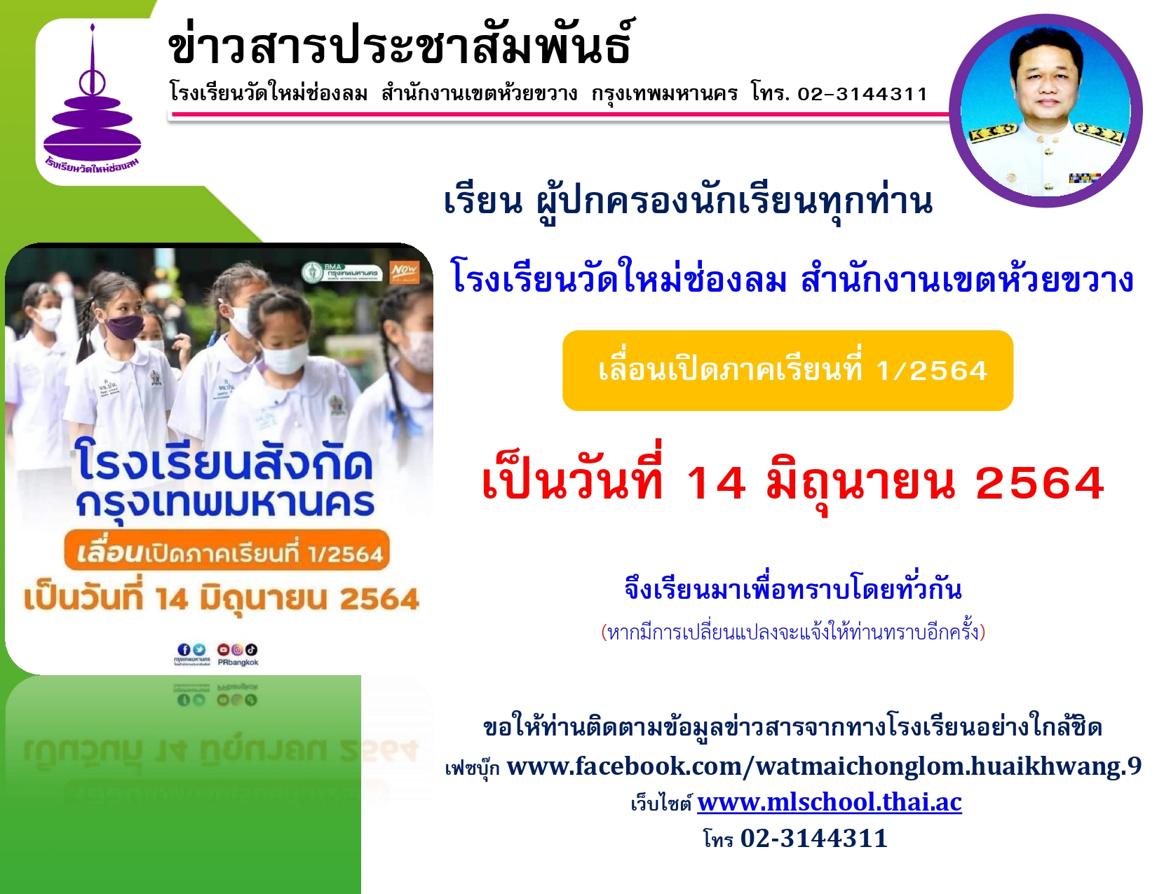 แจ้งเลื่อนเปิดภาคเรียนที่ 1 ปีการศึกษา 2564 เป็นวันที่ 14 มิถุนายน 2564