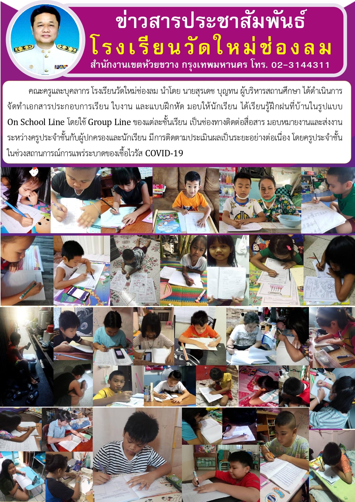 คณะครูและบุคลากร โรงเรียนวัดใหม่ช่องลม นำโดย นายสุรเดช บุญทน ผู้บริหารสถานศึกษา ได้ดำเนินการจัดทำเอกสารประกอบการเรียน ใบงาน และแบบฝึกหัด มอบให้นักเรียน ได้เรียนรู้ฝึกฝนที่บ้านในรูปแบบ On School Line โดยใช้ Group Line ของแต่ละชั้นเรียน เป็นช่องทางติดต่อสื่อสาร มอบหมายงานและส่งงาน ระหว่างครูประจำชั้นกับผู้ปกครองและนักเรียน มีการติดตามประเมินผลเป็นระยะอย่างต่อเนื่อง โดยครูประจำชั้น ในช่วงสถานการณ์การแพร่ระบาดของเชื้อไวรัส COVID-19