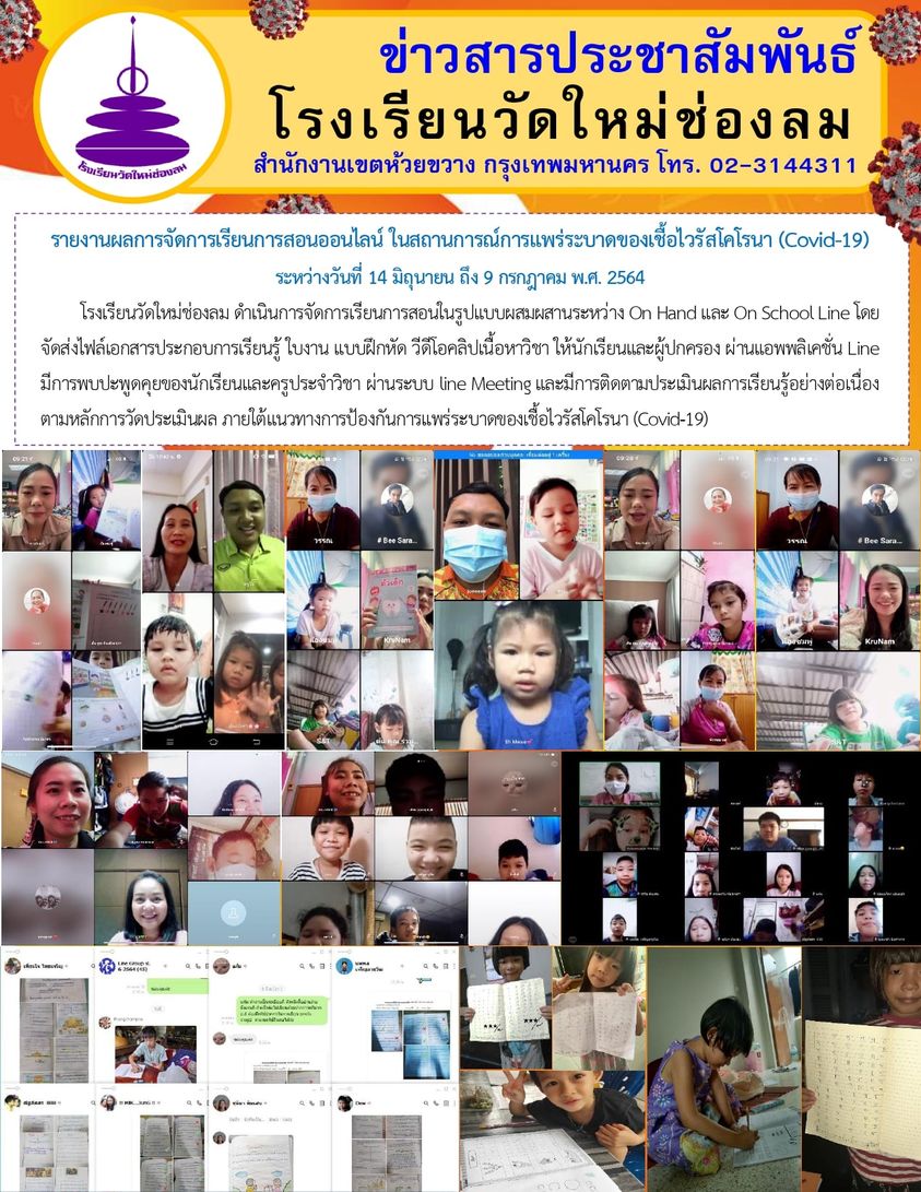 ข่าวสารประชาสัมพันธ์ โรงเรียนวัดใหม่ช่องลม ดำเนินการจัดการเรียนการสอนในรูปแบบผสมผสานระหว่าง On Hand และ On School Line โดยจัดส่งไฟล์เอกสารประกอบการเรียนรู้ ใบงาน แบบฝึกหัด คลิปวีดีโอเนื้อหา ให้นักเรียนและผู้ปกครอง ผ่านแอพพลิเคชัน line มีการพบปะพูดคุย แลกเปลี่ยนเรียนรู้กับครูประจำวิชา ผ่านระบบ line meeting และมีการติดตามประเมินผลการเรียนรู้อย่างต่อเนื่อง ตามหลักการวัดประเมินผล ภายใต้แนวทางการป้องกันการแพร่ระบาดของเชื้อไวรัสโคโรนา (COVID-19)