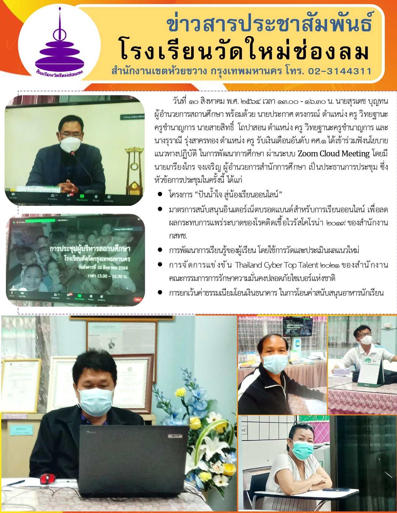 วันที่ 10 สิงหาคม พ.ศ. 2564 เวลา 13.00 น. นายสุรเดช บุญทน ผู้อำนวยการสถานศึกษา พร้อมด้วย นายประกาศ ตรงกรณ์ ตำแหน่ง ครู วิทยฐานะ ครูชำนาญการ นายสายสิทธิ์ โถปาสอน ตำแหน่ง ครู วิทยฐานะครูชำนาญการ และนางรุราณี รุ่งสาครทอง ตำแหน่ง ครู รับเงินเดือนอันดับ คศ.1 ได้เข้าร่วมฟังนโยบายแนวทางปฏิบัติ ในการพัฒนาการศึกษา ผ่านระบบ Zoom Cloud Meeting โดยมี นายเกรียงไกร จงเจริญ ผู้อำนวยการสำนักการศึกษา เป็นประธานการประชุม ซึ่งหัวข้อการประชุมในครั้งนี้ ได้แก่