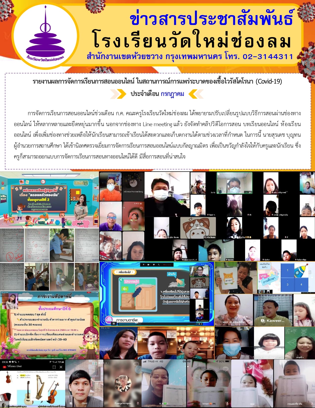 การจัดการเรียนการสอนออนไลน์ช่วงเดือน ก.ค. คณะครูโรงเรียนวัดใหม่ช่องลม ได้พยายามปรับเปลี่ยนรูปแบบวิธีการสอนผ่านช่องทางออนไลน์ ให้หลากหลายและยืดหยุ่นมากขึ้น นอกจากช่องทาง Line meeting แล้ว ยังจัดทำคลิปวิดีโอการสอน บทเรียนออนไลน์ ห้องเรียนออนไลน์ เพื่อเพิ่มช่องทางช่วยเหลือให้นักเรียนสามารถเข้าเรียนได้สะดวกและเก็บตกงานได้ตามช่วงเวลาที่กำหนด ในการนี้ นายสุรเดช บุญทน ผู้อำนวยการสถานศึกษา ได้เข้านิเทศตรวจเยี่ยมการจัดการเรียนการสอนออนไลน์แบบกัลญาณมิตร เพื่อเป็นขวัญกำลังใจให้กับครูและนักเรียน ซึ่งครูก็สามารถออกแบบการจัดการเรียนการสอนทางออนไลน์ได้ดี มีสื่อการสอนที่น่าสนใจ