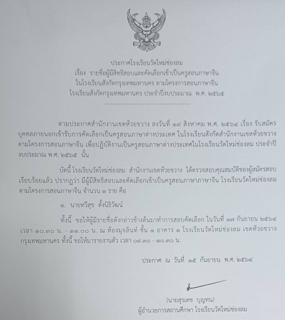 ประกาศโรงเรียนวัดใหม่ช่องลม เรื่อง รายชื่อผู้มีสิทธิสอบคัดเลือกเข้าเป็นครูสอนภาษาจีน