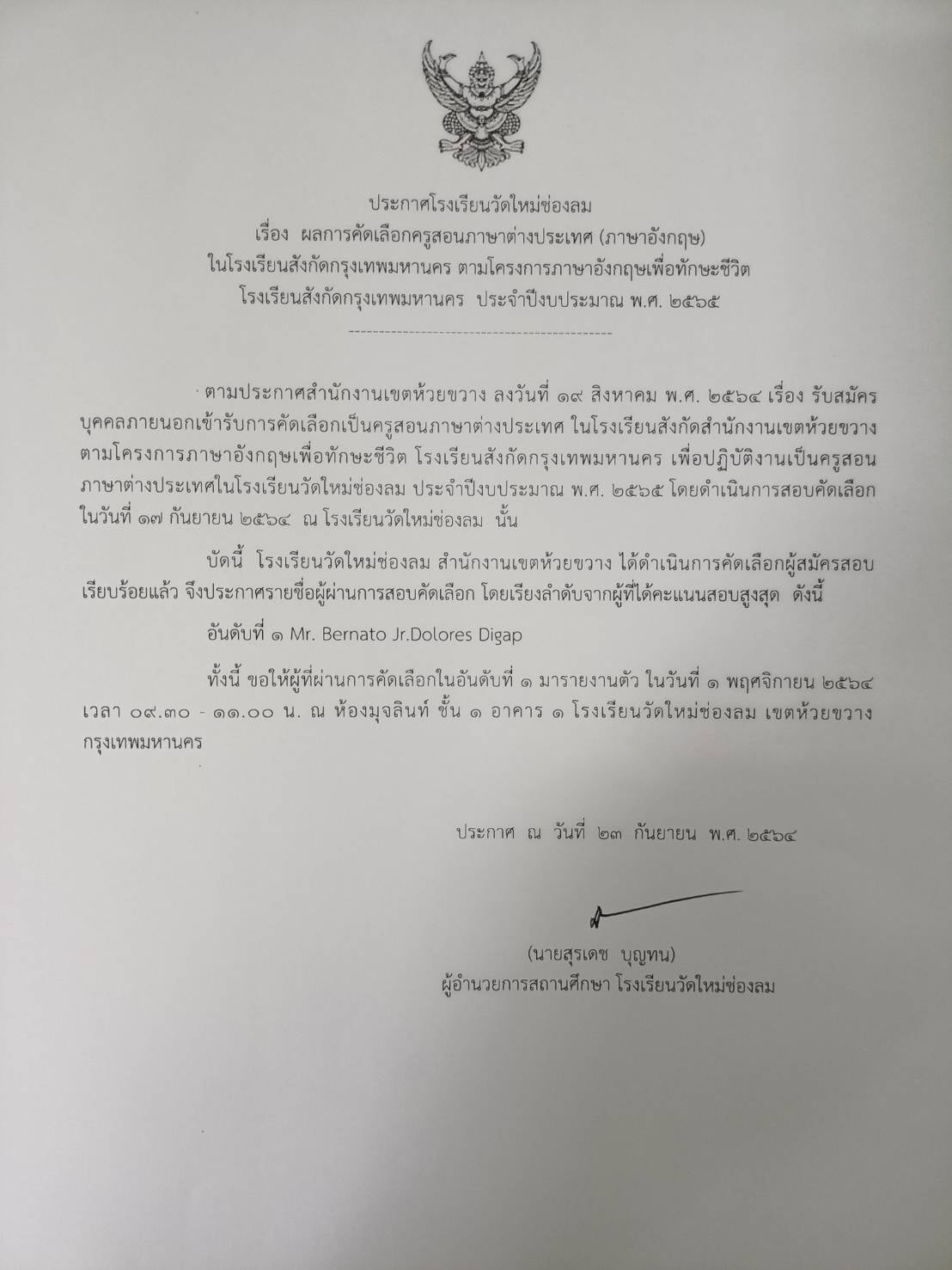 ประกาศผลการสอบคัดเลือกครูสอนภาษาต่างประเทศ (ภาษาอังกฤษ) ตามโครงการภาษาอังกฤษเพื่อทักษะชีวิต ประจำปีงบประมาณ 2565 โรงเรียนวัดใหม่ช่องลม เขตห้วยขวาง กรุงเทพมหานคร