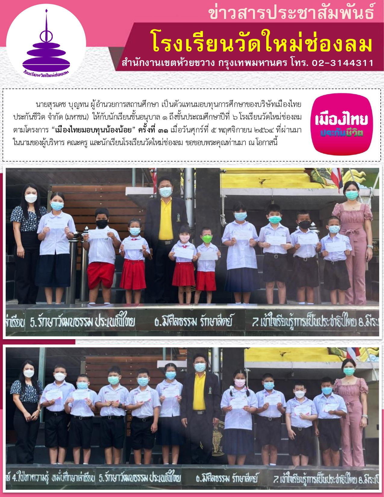 นายสุรเดช บุญทน ผู้อำนวยการสถานศึกษา เป็นตัวแทนมอบทุนการศึกษาของบริษัทเมืองไทยประกันชีวิต จำกัด (มหาชน) ให้กับนักเรียนชั้นอนุบาล ๑ ถึงชั้นประถมศึกษาปีที่ ๖ โรงเรียนวัดใหม่ช่องลม ตามโครงการ “เมืองไทยมอบทุนน้องน้อย” ครั้งที่ ๓๑ เมื่อวันศุกร์ที่ ๕ พฤศจิกายน ๒๕๖๔ ที่ผ่านมา ในนามของผู้บริหาร คณะครู และนักเรียนโรงเรียนวัดใหม่ช่องลม ขอขอบพระคุณท่านมา ณ โอกาสนี้