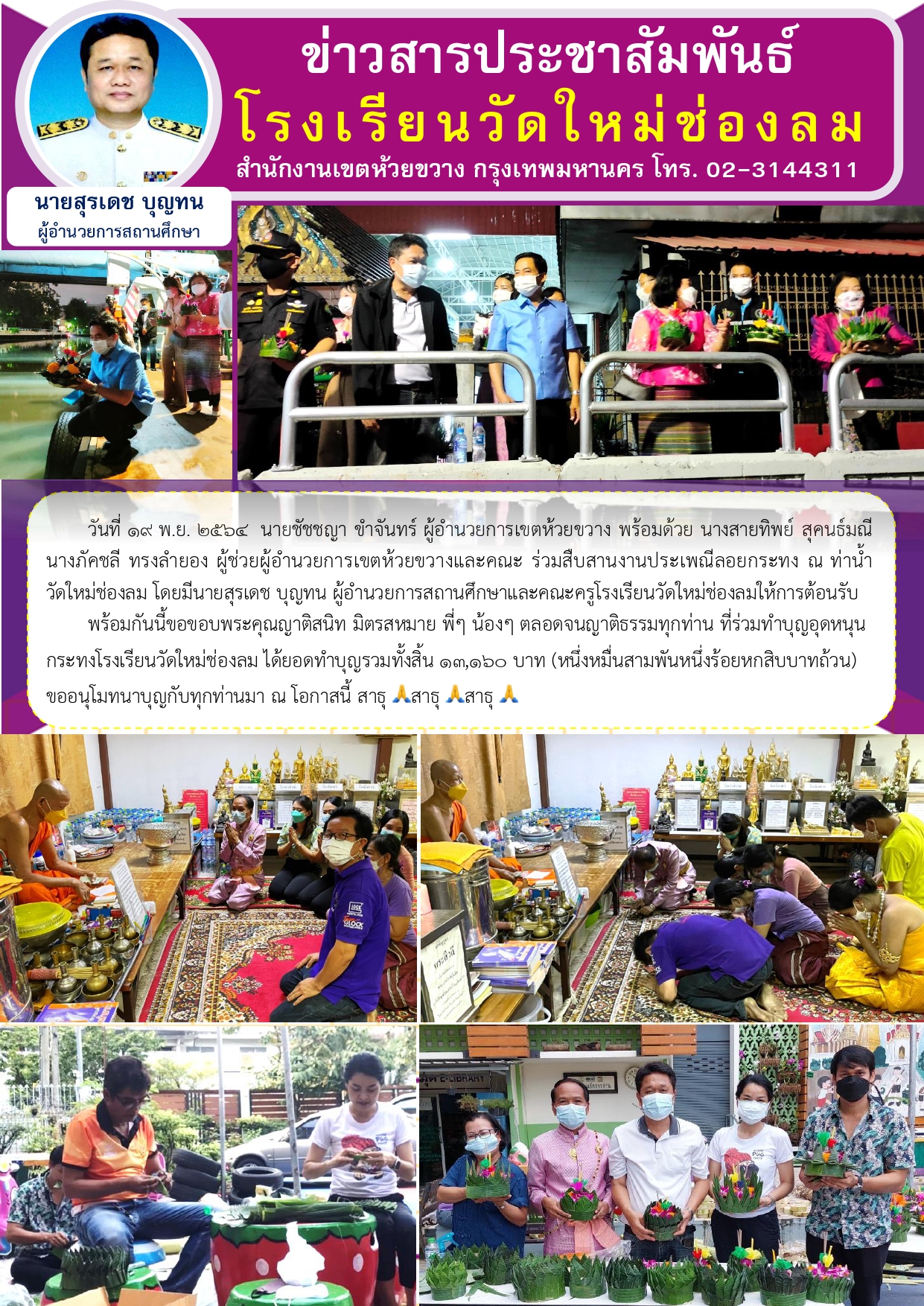 พร้อมกันนี้ขอขอบพระคุณญาติสนิท มิตรสหมาย พี่ๆ น้องๆ ตลอดจนญาติธรรมทุกท่าน ที่ร่วมทำบุญอุดหนุนกระทงโรงเรียนวัดใหม่ช่องลม ได้ยอดทำบุญรวมทั้งสิ้น 13,160 บาท (หนึ่งหมื่นสามพันหนึ่งร้อยหกสิบบาทถ้วน) ขออนุโมทนาบุญกับทุกท่านมา ณ โอกาสนี้ สาธุ สาธุ สาธุ
