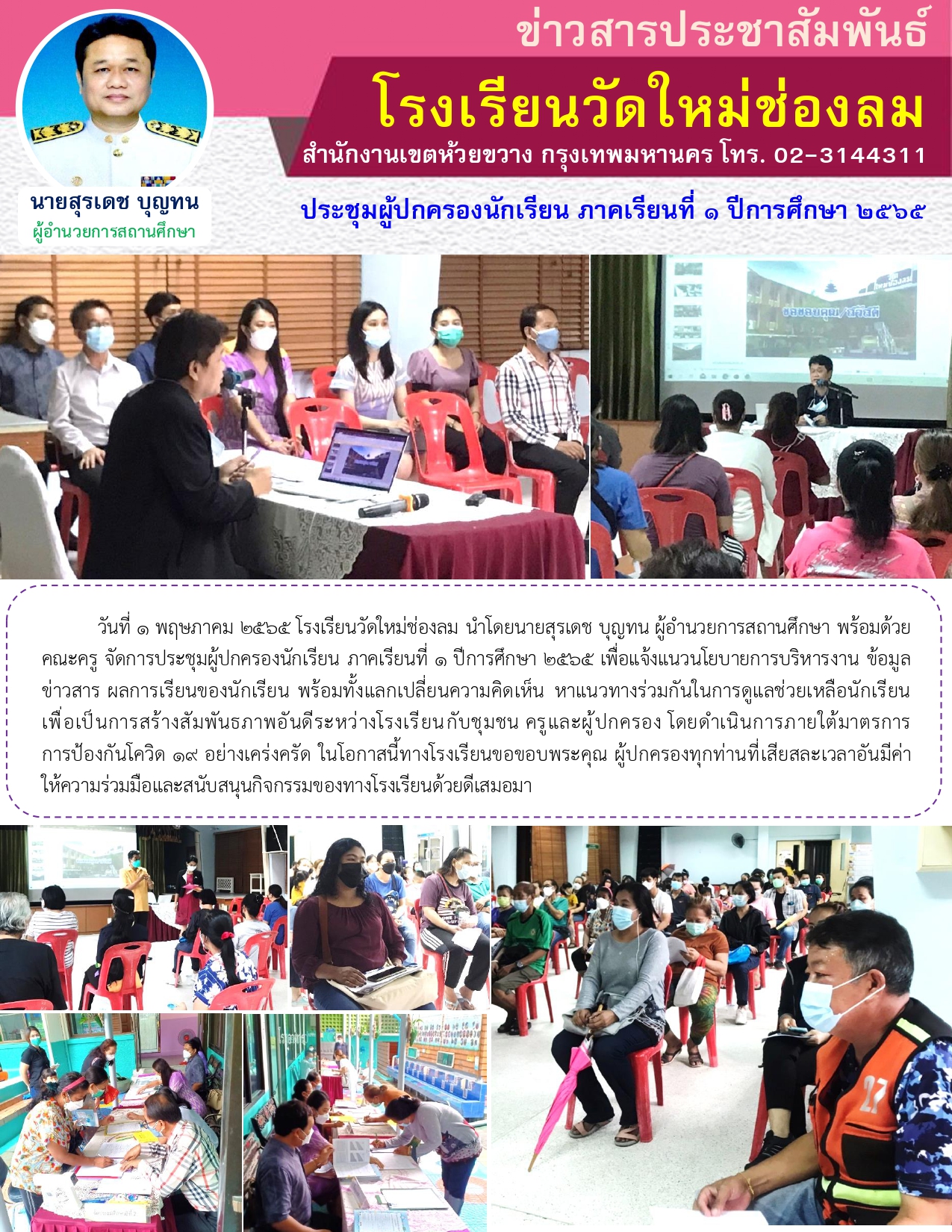 วันที่ 1 พฤษภาคม 2565 โรงเรียนวัดใหม่ช่องลม นำโดยนายสุรเดช บุญทน ผู้อำนวยการสถานศึกษา พร้อมด้วยคณะครู จัดการประชุมผู้ปกครองนักเรียน ภาคเรียนที่ 1 ปีการศึกษา 2565 เพื่อแจ้งแนวนโยบายการบริหารงาน ข้อมูลข่าวสาร ผลการเรียนของนักเรียน พร้อมทั้งแลกเปลี่ยนความคิดเห็น หาแนวทางร่วมกันในการดูแลช่วยเหลือนักเรียน เพื่อเป็นการสร้างสัมพันธภาพอันดีระหว่างโรงเรียนกับชุมชน ครูและผู้ปกครอง โดยดำเนินการภายใต้มาตรการการป้องกันโควิด 19 อย่างเคร่งครัด ในโอกาสนี้ทางโรงเรียนขอขอบพระคุณ ผู้ปกครองทุกท่านที่เสียสละเวลาอันมีค่าให้ความร่วมมือและสนับสนุนกิจกรรมของทางโรงเรียนด้วยดีเสมอมา