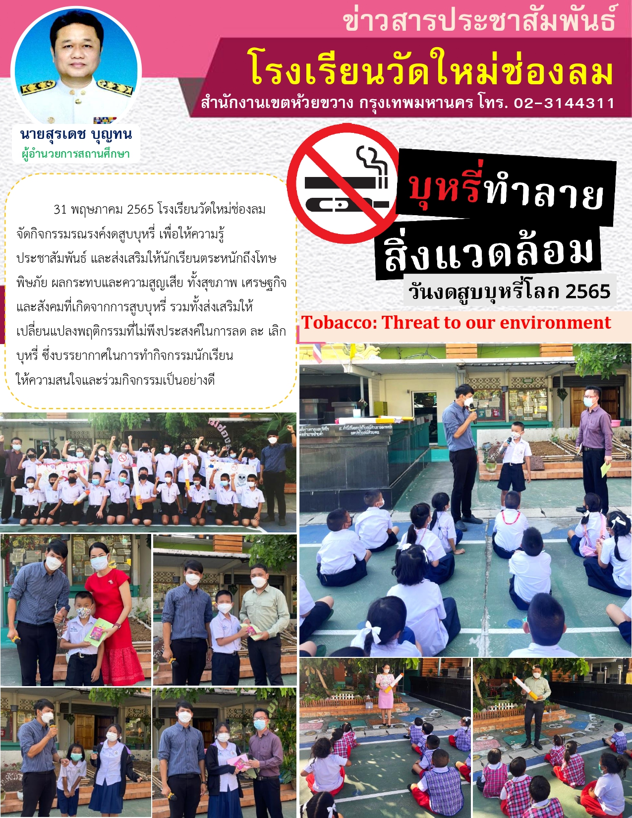 วันที่ 31 พฤษภาคม 2565 ที่ผ่านมา โรงเรียนวัดใหม่ช่องลม จัดกิจกรรมรณรงค์งดสูบบุหรี่ เพื่อให้ความรู้ ประชาสัมพันธ์ และส่งเสริมให้นักเรียนตระหนักถึงโทษ พิษภัย ผลกระทบและความสูญเสีย ทั้งสุขภาพ เศรษฐกิจ และสังคมที่เกิดจากการสูบบุหรี่ รวมทั้งส่งเสริมให้เปลี่ยนแปลงพฤติกรรมที่ไม่พึงประสงค์ในการลด ละ เลิก บุหรี่ ซึ่งบรรยากาศในการทำกิจกรรมนักเรียนให้ความสนใจและร่วมกิจกรรมเป็นอย่างดี
