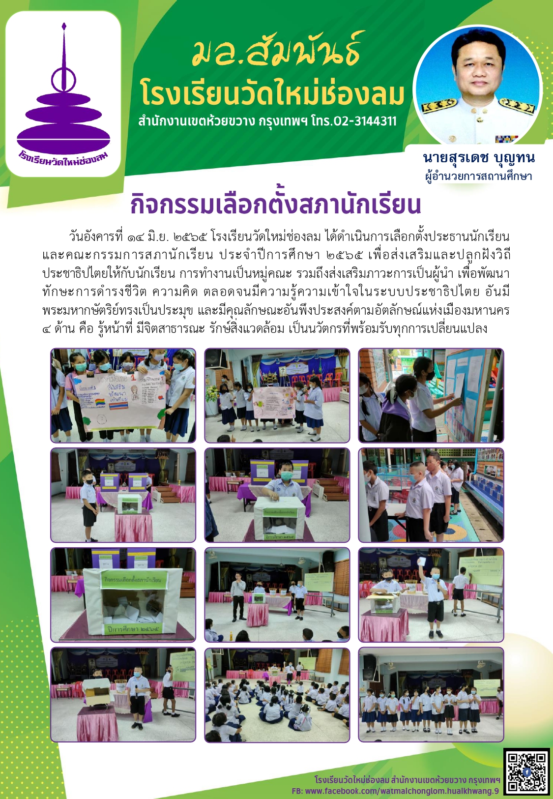 วันอังคารที่ ๑๔ มิ.ย. ๒๕๖๕ ที่ผ่านมา โรงเรียนวัดใหม่ช่องลม ได้ดำเนินการเลือกตั้งประธานนักเรียน และคณะกรรมการสภานักเรียน ประจำปีการศึกษา ๒๕๖๕ เพื่อส่งเสริมและปลูกฝังวิถีประชาธิปไตยให้กับนักเรียน การทำงานเป็นหมู่คณะ รวมถึงส่งเสริมภาวะการเป็นผู้นำ เพื่อพัฒนาทักษะการดำรงชีวิต ความคิด ตลอดจนมีความรู้ความเข้าใจในระบบประชาธิปไตย อันมีพระมหากษัตริย์ทรงเป็นประมุข และมีคุณลักษณะอันพึงประสงค์ตามอัตลักษณ์แห่งเมืองมหานคร ๔ ด้าน คือ รู้หน้าที่ มีจิตสาธารณะ รักษ์สิ่งแวดล้อม เป็นนวัตกรที่พร้อมรับทุกการเปลี่ยนแปลง