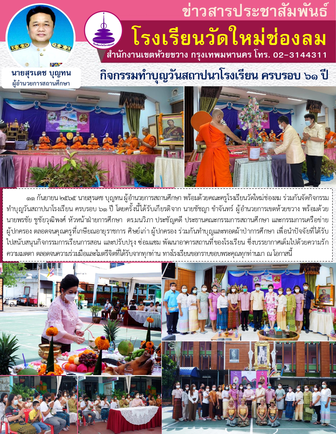 11 กันยายน 2565 ที่ผ่านมา นายสุรเดช บุญทน ผู้อำนวยการสถานศึกษา พร้อมด้วยคณะครูโรงเรียนวัดใหม่ช่องลม ร่วมกันจัดกิจกรรมทำบุญวันสถาปนาโรงเรียน ครบรอบ 61 ปี โดยครั้งนี้ได้รับเกียรติจาก นายชัชญา ขำจันทร์ ผู้อำนวยการเขตห้วยขวาง พร้อมด้วยนายพรชัย ชูชัยวุฒิพงศ์ หัวหน้าฝ่ายการศึกษา ดร.มนวิภา ประชัญคดี ประธานคณะกรรมการสถานศึกษา และกรรมการเครือข่ายผู้ปกครอง ตลอดจนคุณครูที่เกษียณอายุราชการ ศิษย์เก่า ผู้ปกครอง ร่วมกันทำบุญและทอดผ้าป่าการศึกษา เพื่อนำปัจจัยที่ได้รับไปสนับสนุนกิจกรรมการเรียนการสอน และปรับปรุง ซ่อมแซม พัฒนาอาคารสถานที่ของโรงเรียน ซึ่งบรรยากาศเต็มไปด้วยความรัก ความเมตตา ตลอดจนความร่วมมือและไมตรีจิตที่ได้รับจากทุกท่าน ทางโรงเรียนขอกราบขอบพระคุณทุกท่านมา ณ โอกาสนี้