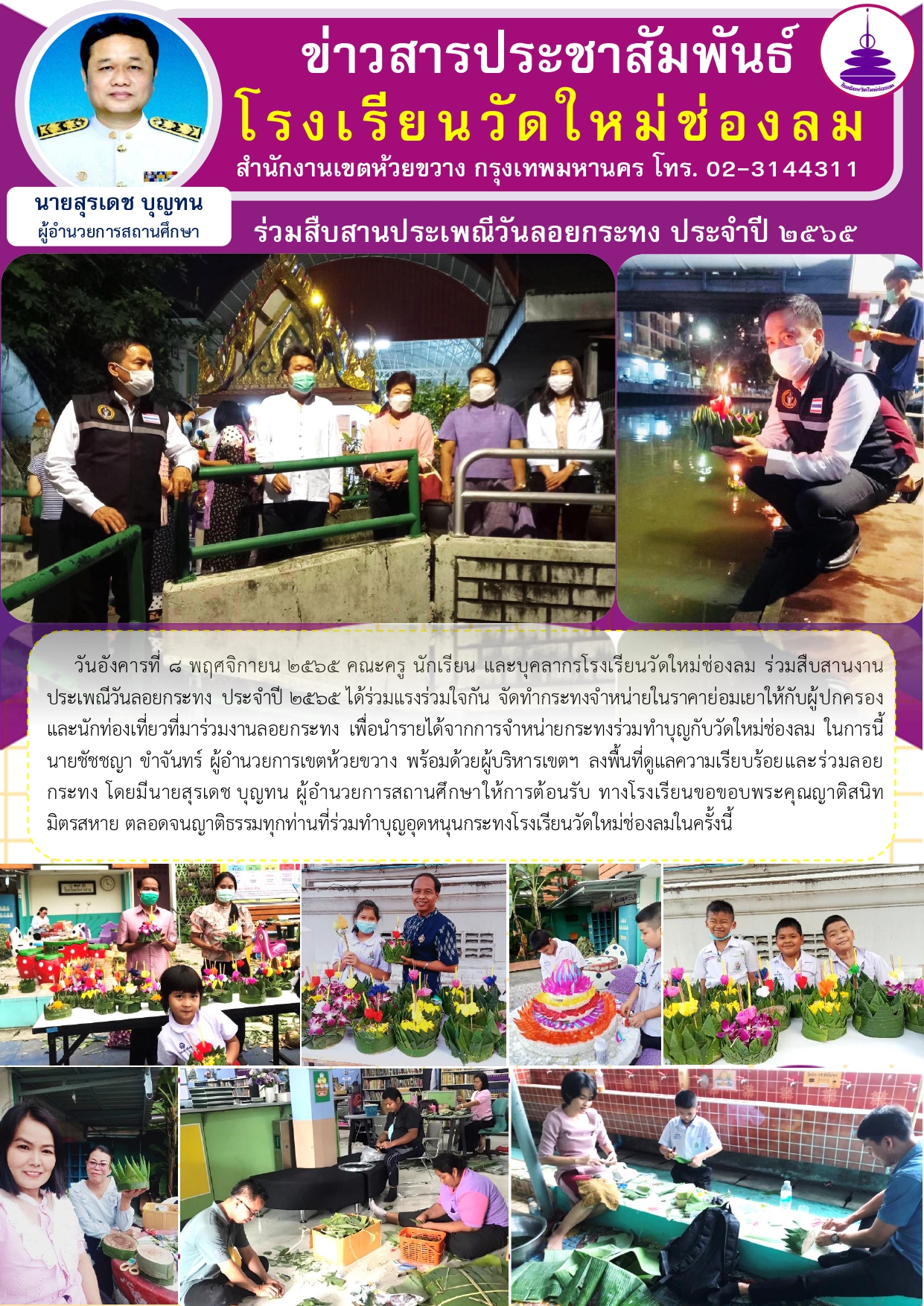 วันอังคารที่ 8 พฤศจิกายน 2565 คณะครู นักเรียน และบุคลากรโรงเรียนวัดใหม่ช่องลม ร่วมสืบสานงานประเพณีวันลอยกระทง ประจำปี 2565 ได้ร่วมแรงร่วมใจกัน จัดทำกระทงจำหน่ายในราคาย่อมเยาให้กับผู้ปกครองและนักท่องเที่ยวที่มาร่วมงานลอยกระทง เพื่อนำรายได้จากการจำหน่ายกระทงร่วมทำบุญกับวัดใหม่ช่องลม ในการนี้นายชัชชญา ขำจันทร์ ผู้อำนวยการเขตห้วยขวาง พร้อมด้วยผู้บริหารเขตฯ ลงพื้นที่ดูแลความเรียบร้อยและร่วมลอยกระทง โดยมีนายสุรเดช บุญทน ผู้อำนวยการสถานศึกษาให้การต้อนรับ ทางโรงเรียนขอขอบพระคุณญาติสนิท มิตรสหาย ตลอดจนญาติธรรมทุกท่านที่ร่วมทำบุญอุดหนุนกระทงโรงเรียนวัดใหม่ช่องลมในครั้งนี้