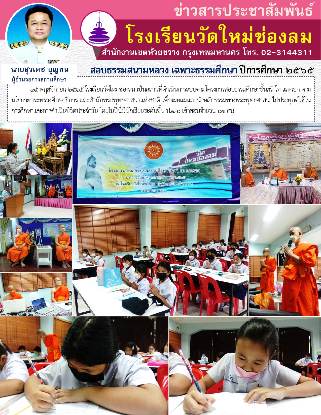 15 พฤศจิกายน 2565 โรงเรียนวัดใหม่ช่องลม เป็นสถานที่ดำเนินการสอบตามโครงการสอบธรรมศึกษาชั้นตรี โท และเอก ตามนโยบายกระทรวงศึกษาธิการ และสำนักพระพุทธศาสนาแห่งชาติ เพื่อเผยแผ่และนำหลักธรรมทางพระพุทธศาสนาไปประยุกต์ใช้ในการศึกษาและการดำเนินชีวิตประจำวัน โดยในปีนี้มีนักเรียนระดับชั้น ป.4-6 เข้าสอบจำนวน 61 คน