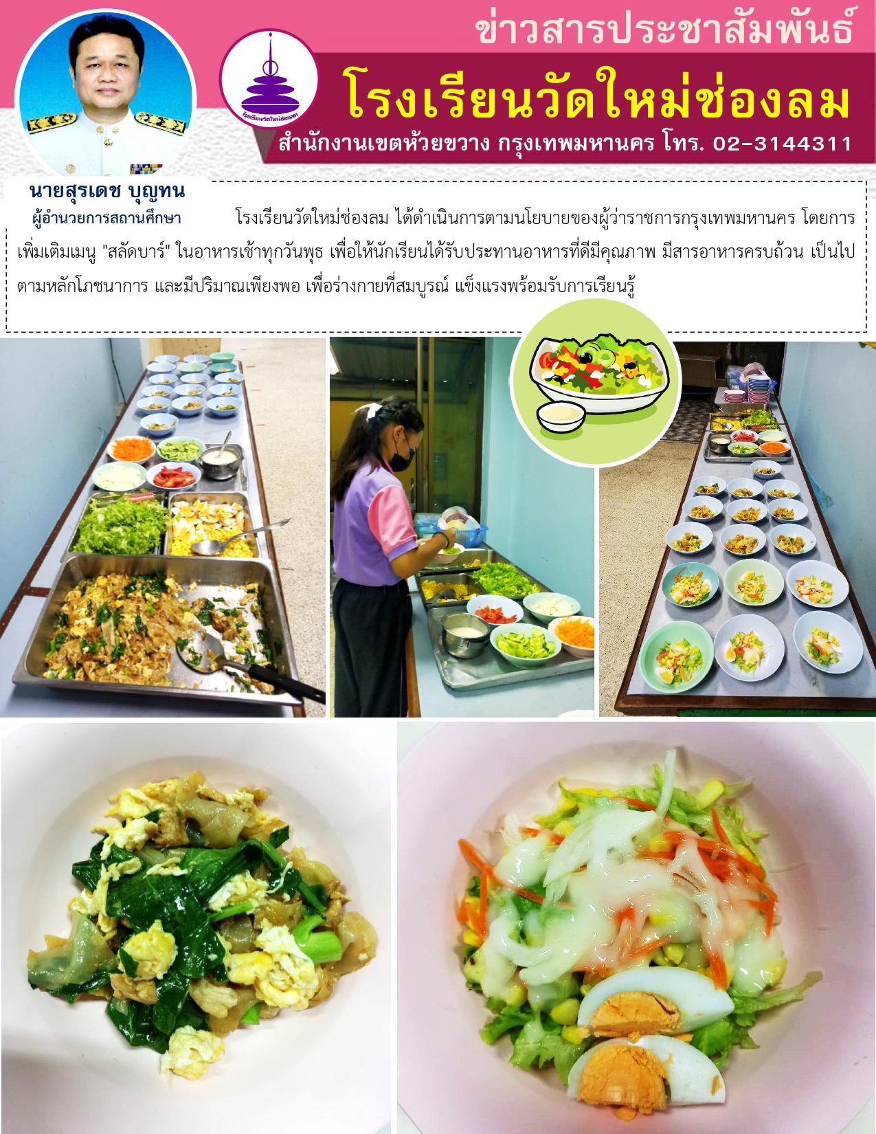 โรงเรียนวัดใหม่ช่องลม ได้ดำเนินการตามนโยบายของผู้ว่าราชการกรุงเทพมหานคร โดยการเพิ่มเติมเมนู "สลัดบาร์" ในอาหารเช้าทุกวันพุธ เพื่อให้นักเรียนได้รับประทานอาหารที่ดีมีคุณภาพ มีสารอาหารครบถ้วน เป็นไปตามหลักโภชนาการ และมีปริมาณเพียงพอ เพื่อร่างกายที่สมบูรณ์ แข็งแรงพร้อมรับการเรียนรู้
