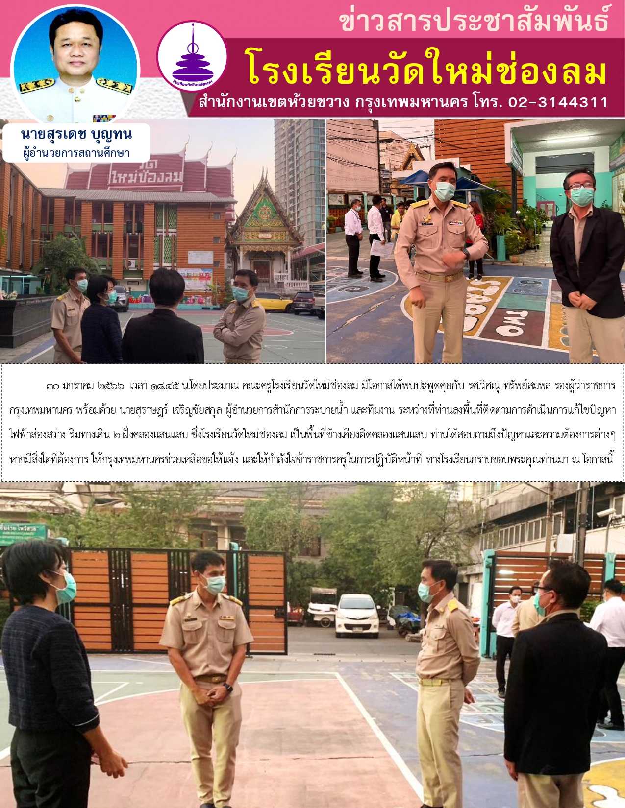 วันที่ 30 มกราคม 2566 เวลา 18.45 น.โดยประมาณ คณะครูโรงเรียนวัดใหม่ช่องลม มีโอกาสได้พบปะพูดคุยกับ รศ.วิศณุ ทรัพย์สมพล รองผู้ว่าราชการกรุงเทพมหานคร พร้อมด้วย นายสุราษฎร์ เจริญชัยสกุล ผู้อำนวยการสำนักการระบายน้ำ และทีมงาน ระหว่างที่ท่านลงพื้นที่ติดตามการดำเนินการแก้ไขปัญหาไฟฟ้าส่องสว่าง ริมทางเดิน 2 ฝั่งคลองแสนแสบ ซึ่งโรงเรียนวัดใหม่ช่องลม เป็นพื้นที่ข้างเคียงติดคลองแสนแสบ ท่านได้สอบถามถึงปัญหาและความต้องการต่างๆ หากมีสิ่งใดที่ต้องการ ให้กรุงเทพมหานครช่วยเหลือขอให้แจ้ง และให้กำลังใจข้าราชการครูในการปฏิบัติหน้าที่ ทางโรงเรียนกราบขอบพระคุณท่านมา ณ โอกาสนี้