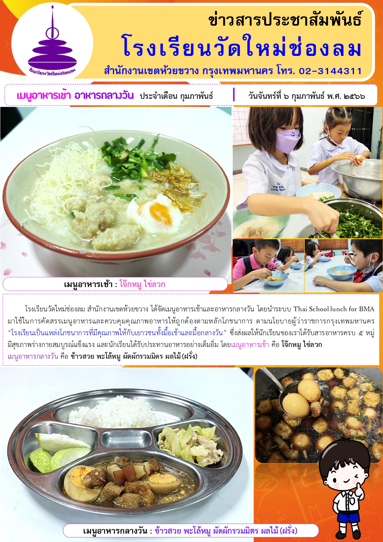 อาหารเช้า อาหารกลางวัน สำหรับนักเรียนโรงเรียนวัดใหม่ช่องลม ประจำวันที่ 6 ก.พ. 2566