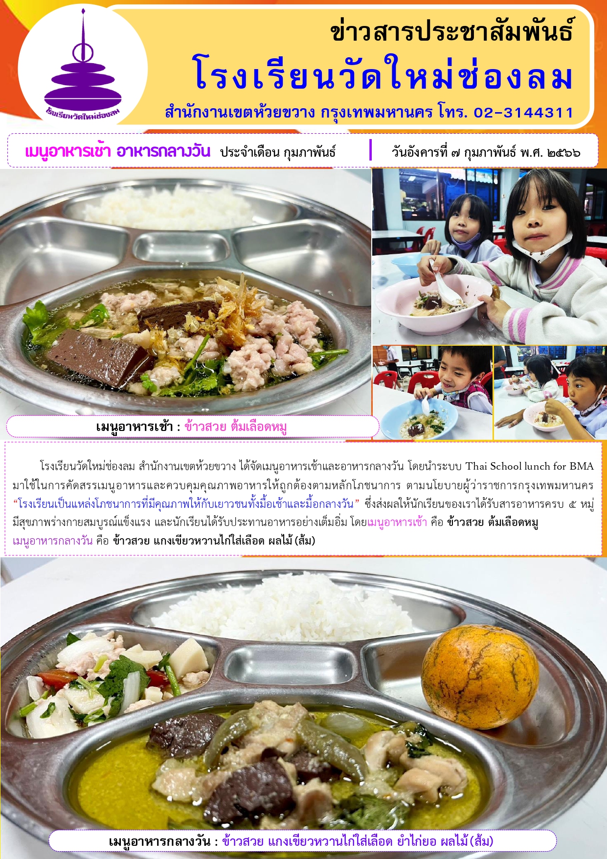 อาหารเช้า อาหารกลางวัน สำหรับนักเรียนโรงเรียนวัดใหม่ช่องลม ประจำวันที่ 7 ก.พ. 2566