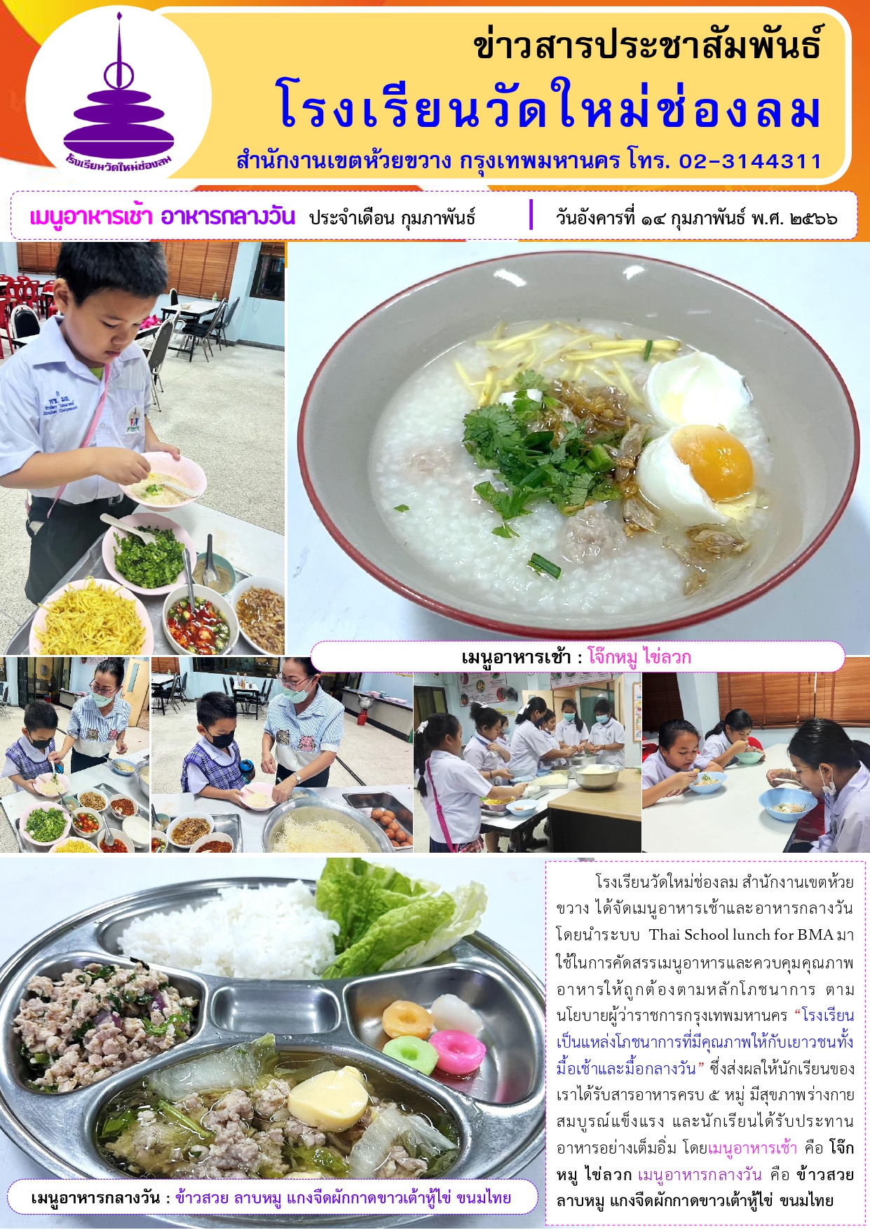 อาหารเช้า อาหารกลางวัน สำหรับนักเรียนโรงเรียนวัดใหม่ช่องลม ประจำวันที่ 14 ก.พ. 2566