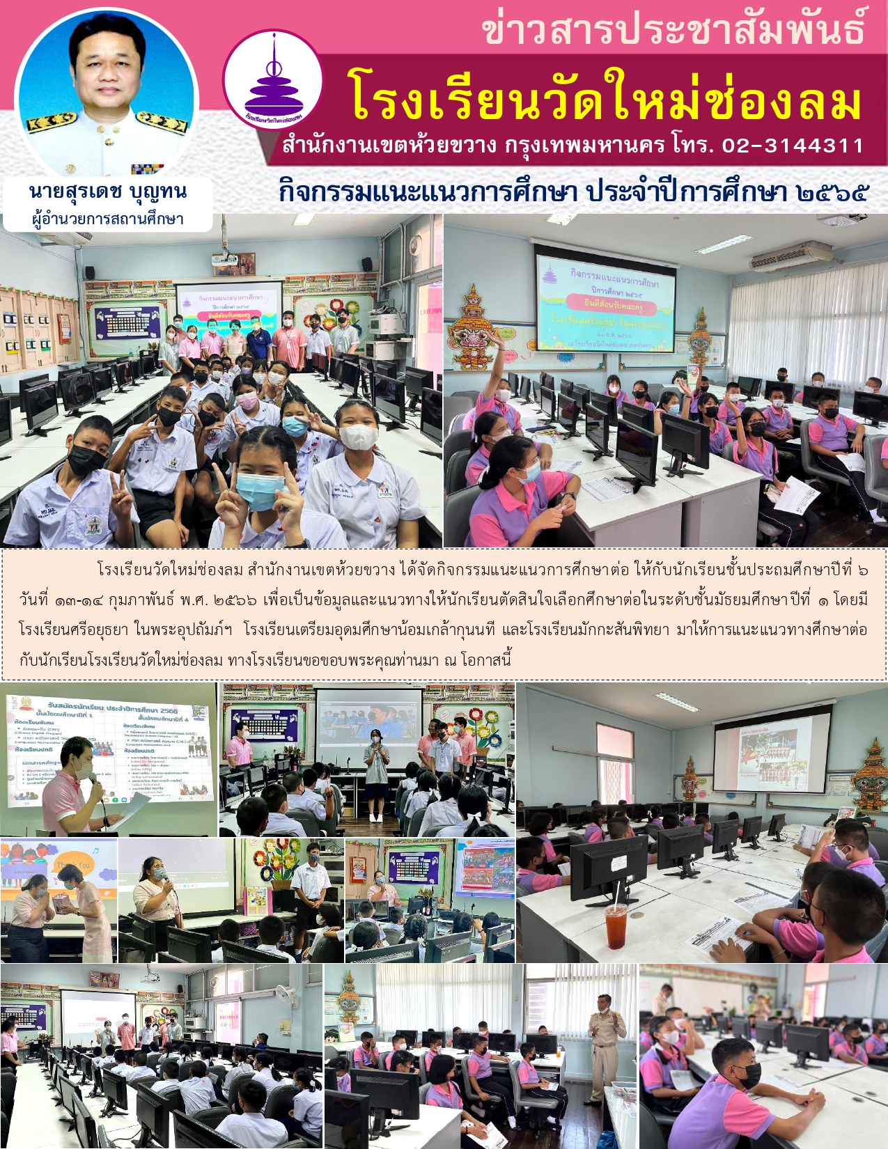 โรงเรียนวัดใหม่ช่องลม สำนักงานเขตห้วยขวาง ได้จัดกิจกรรมแนะแนวการศึกษาต่อ ให้กับนักเรียนชั้นประถมศึกษาปีที่ 6 วันที่ 13-14 กุมภาพันธ์ พ.ศ. 2566 เพื่อเป็นข้อมูลและแนวทางให้นักเรียนตัดสินใจเลือกศึกษาต่อในระดับชั้นมัธยมศึกษาปีที่ 1 โดยมีโรงเรียนศรีอยุธยา ในพระอุปถัมภ์ฯ โรงเรียนเตรียมอุดมศึกษาน้อมเกล้ากุนนที และโรงเรียนมักกะสันพิทยา มาให้การแนะแนวทางศึกษาต่อกับนักเรียนโรงเรียนวัดใหม่ช่องลม ทางโรงเรียนขอขอบพระคุณท่านมา ณ โอกาสนี้