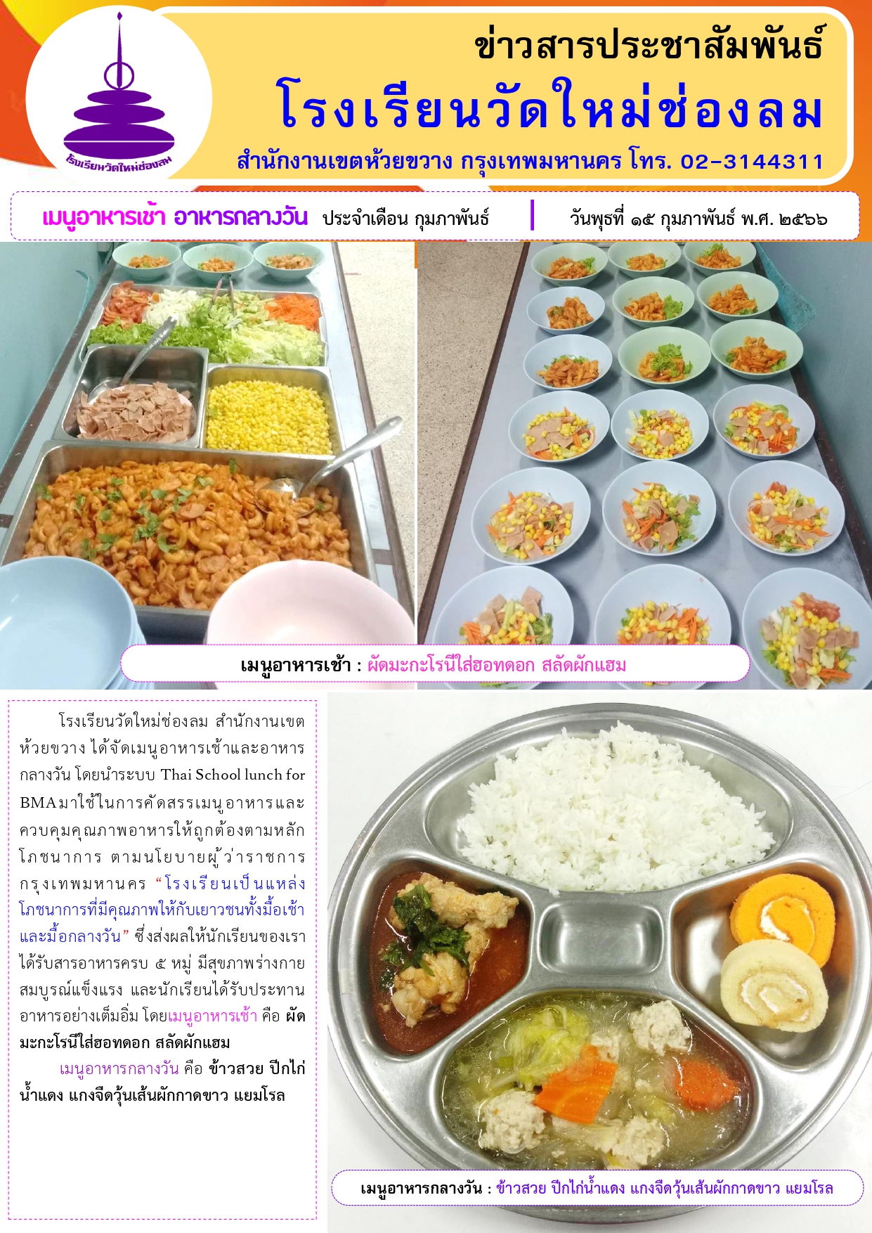 อาหารเช้า อาหารกลางวัน สำหรับนักเรียนโรงเรียนวัดใหม่ช่องลม ประจำวันที่ 15 ก.พ. 2566