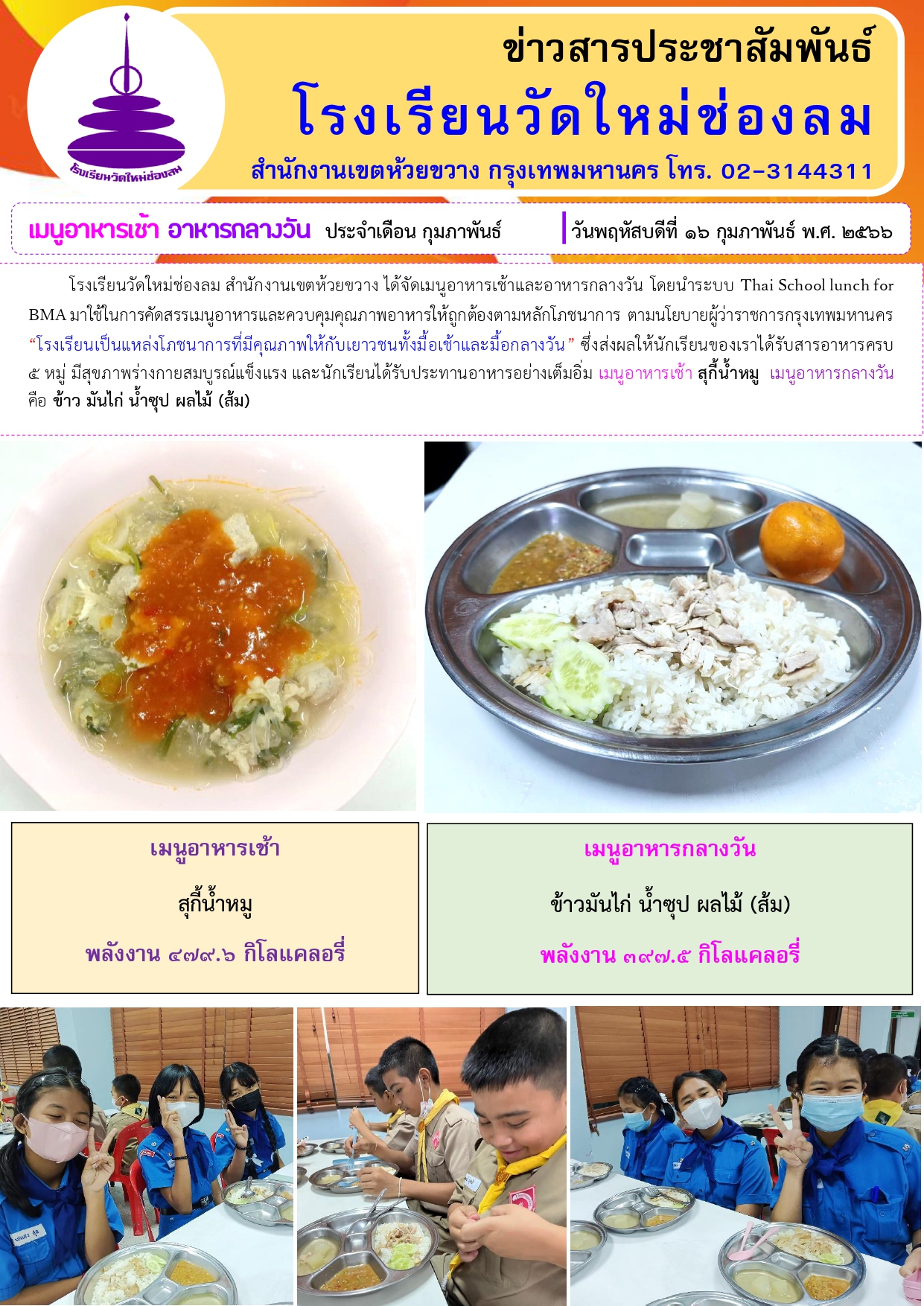 อาหารเช้า อาหารกลางวัน สำหรับนักเรียนโรงเรียนวัดใหม่ช่องลม ประจำวันที่ 16 ก.พ. 2566