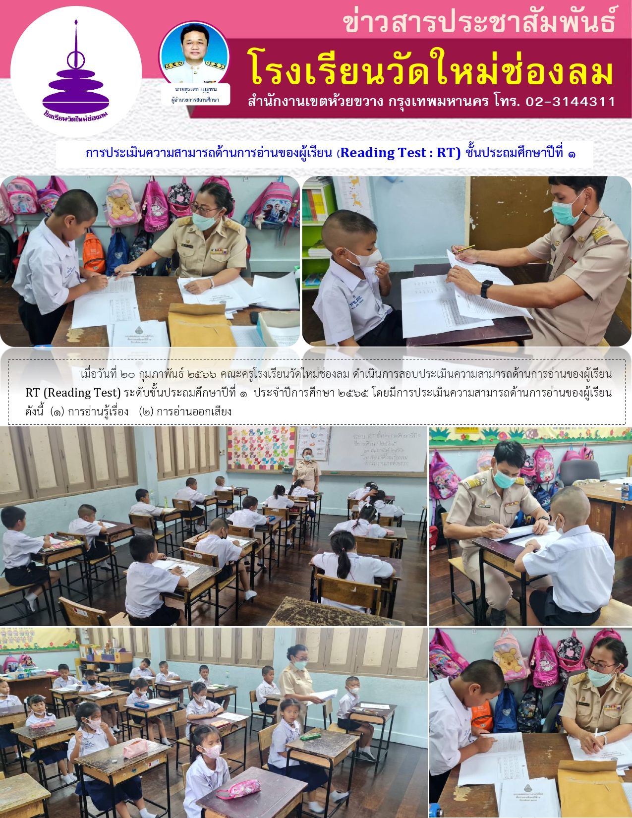 เมื่อวันที่ 20 กุมภาพันธ์ 2566 คณะครูโรงเรียนวัดใหม่ช่องลม ดำเนินการสอบประเมินความสามารถด้านการอ่านของผู้เรียน RT (Reading Test) ระดับชั้นประถมศึกษาปีที่ 1 ประจำปีการศึกษา 2565 โดยมีการประเมินความสามารถด้านการอ่านของผู้เรียน ดังนี้ (1) การอ่านรู้เรื่อง (2) การอ่านออกเสียง