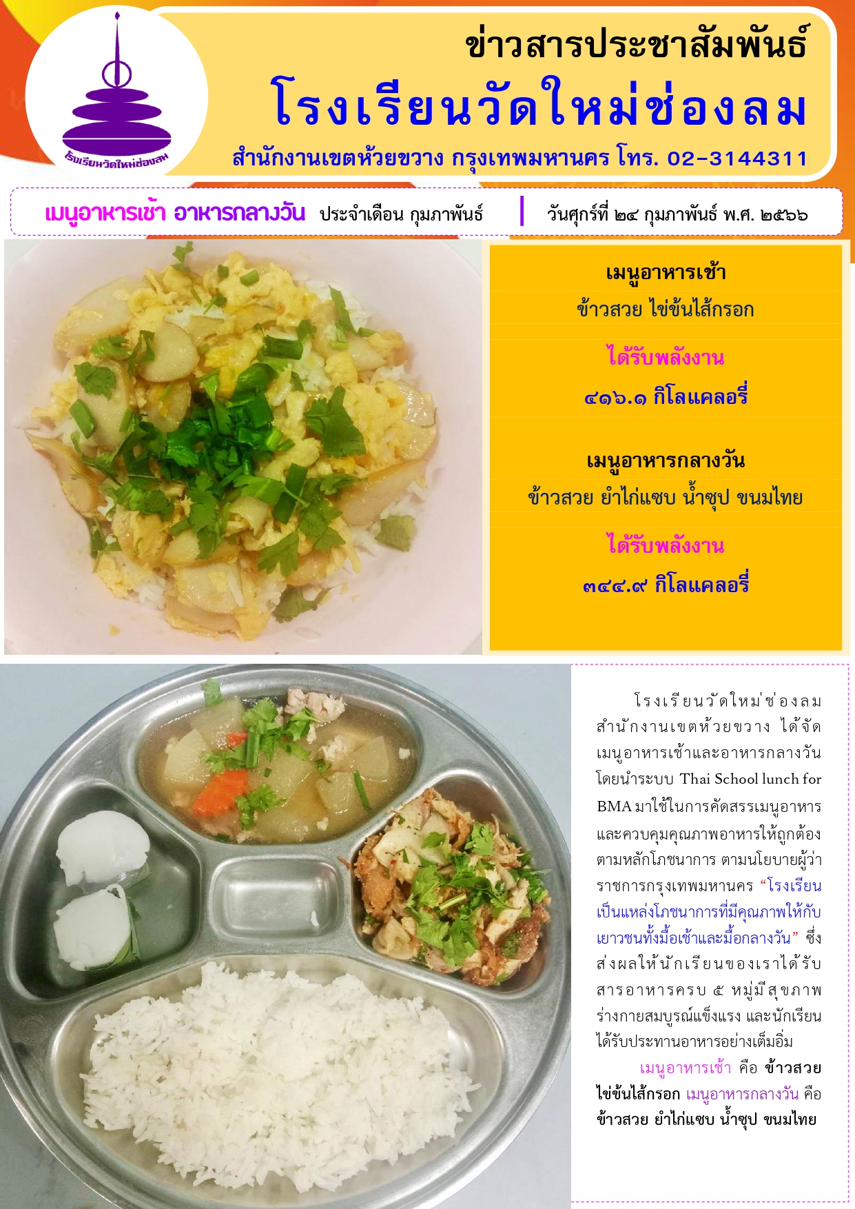 อาหารเช้า อาหารกลางวัน สำหรับนักเรียนโรงเรียนวัดใหม่ช่องลม ประจำวันที่ 24 ก.พ. 2566