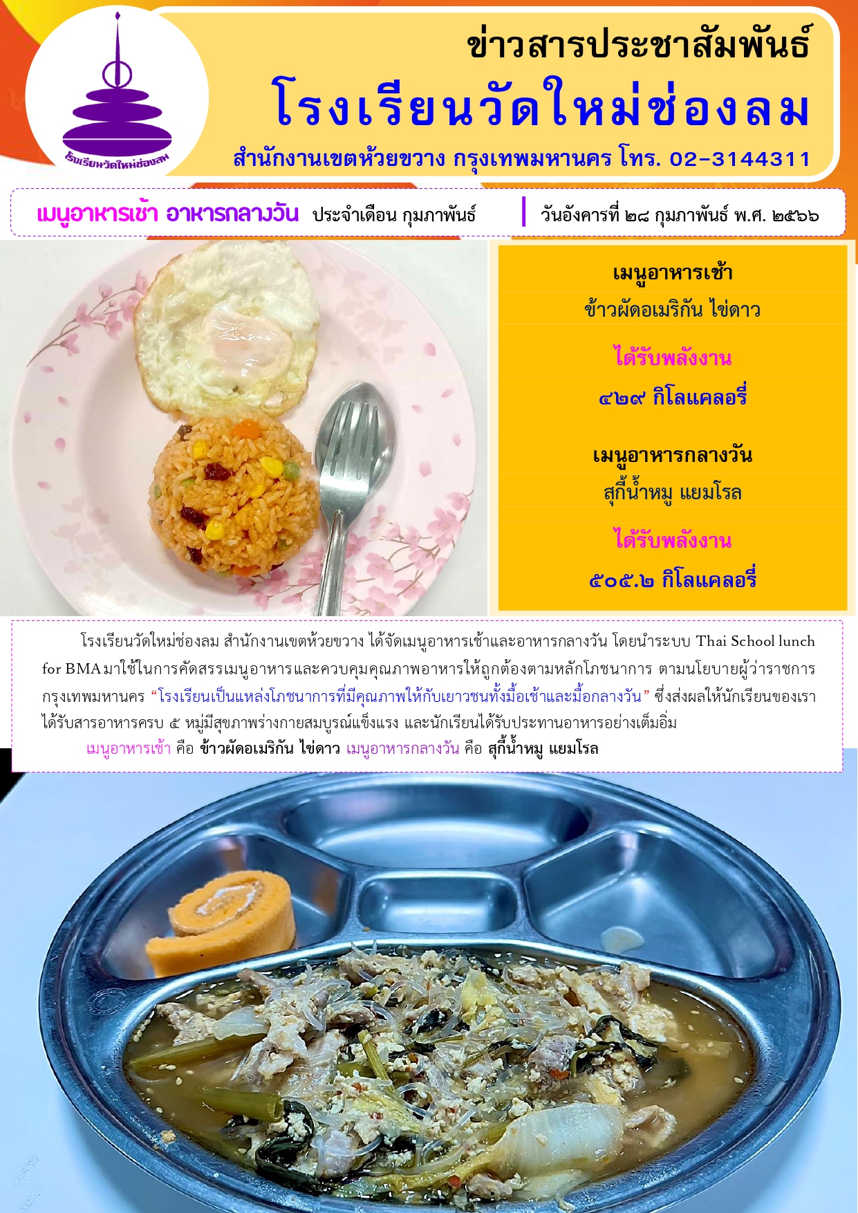 อาหารเช้า อาหารกลางวัน สำหรับนักเรียนโรงเรียนวัดใหม่ช่องลม ประจำวันที่ 28ก.พ. 2566