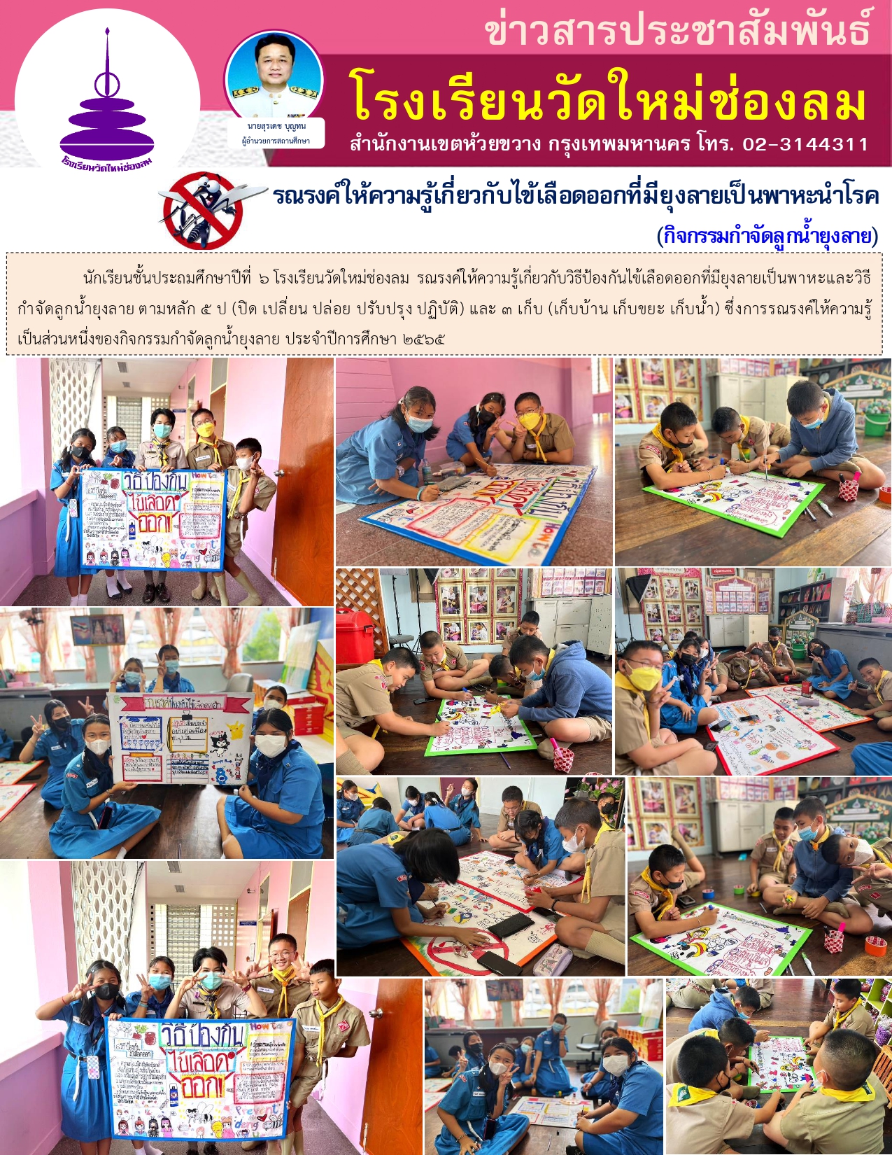 นักเรียนชั้นประถมศึกษาปีที่ 6 โรงเรียนวัดใหม่ช่องลม รณรงค์ให้ความรู้เกี่ยวกับวิธีป้องกันไข้เลือดออกที่มียุงลายเป็นพาหะและวิธีกำจัดลูกน้ำยุงลาย ตามหลัก 5 ป (ปิด เปลี่ยน ปล่อย ปรับปรุง ปฏิบัติ) และ 3 เก็บ (เก็บบ้าน เก็บขยะ เก็บน้ำ) ซึ่งการรณรงค์ให้ความรู้ เป็นส่วนหนึ่งของกิจกรรมกำจัดลูกน้ำยุงลาย ประจำปีการศึกษา 2565