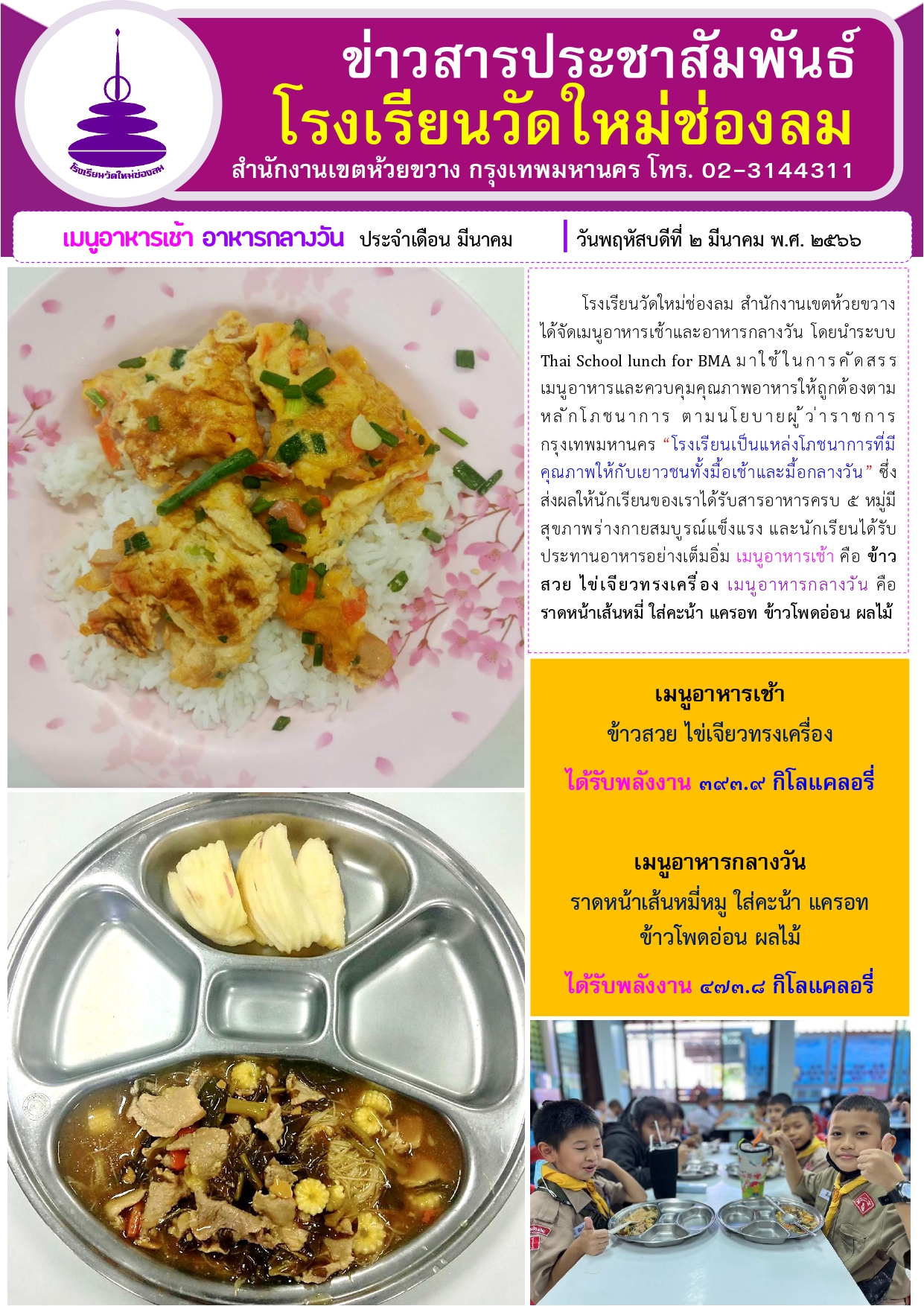 อาหารเช้า อาหารกลางวัน สำหรับนักเรียนโรงเรียนวัดใหม่ช่องลม ประจำวันที่ 2 มี.ค. 2566