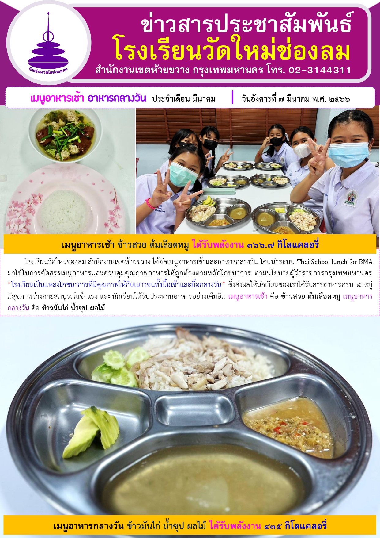 อาหารเช้า อาหารกลางวัน สำหรับนักเรียนโรงเรียนวัดใหม่ช่องลม ประจำวันที่ 7 มี.ค. 2566