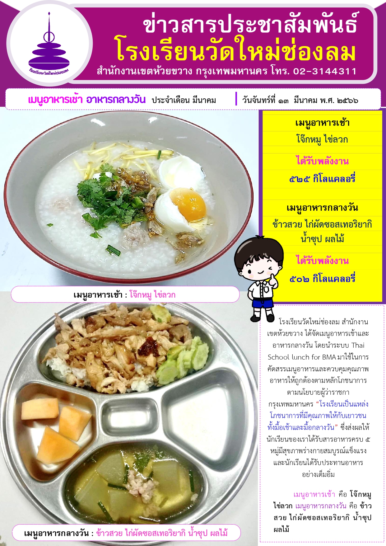 อาหารเช้า อาหารกลางวัน สำหรับนักเรียนโรงเรียนวัดใหม่ช่องลม ประจำวันที่ 13 มีนาคม 2566