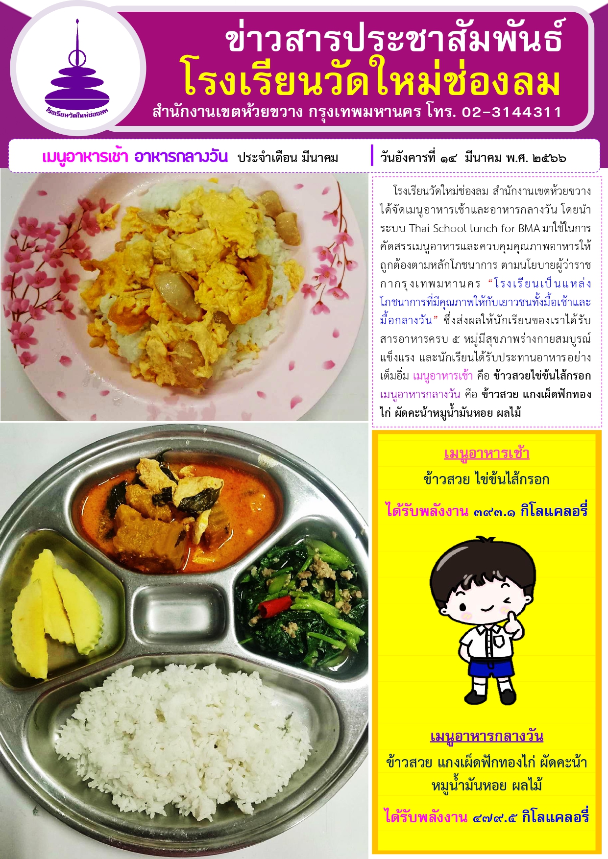 อาหารเช้า อาหารกลางวัน สำหรับนักเรียนโรงเรียนวัดใหม่ช่องลม ประจำวันที่ 14 มีนาคม 2566