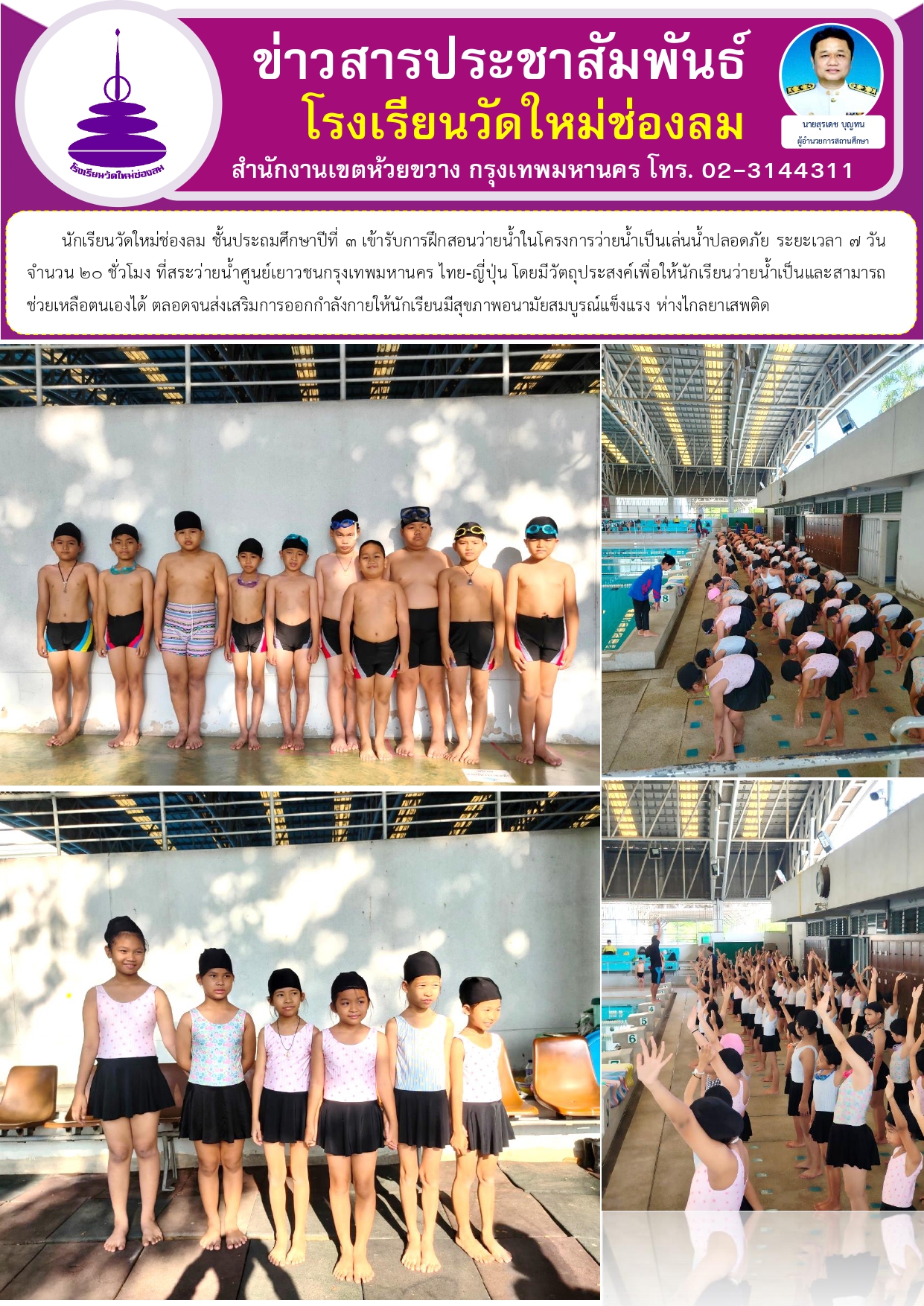 นักเรียนวัดใหม่ช่องลม ชั้นประถมศึกษาปีที่ 3 เข้ารับการฝึกสอนว่ายน้ำในโครงการว่ายน้ำเป็นเล่นน้ำปลอดภัย