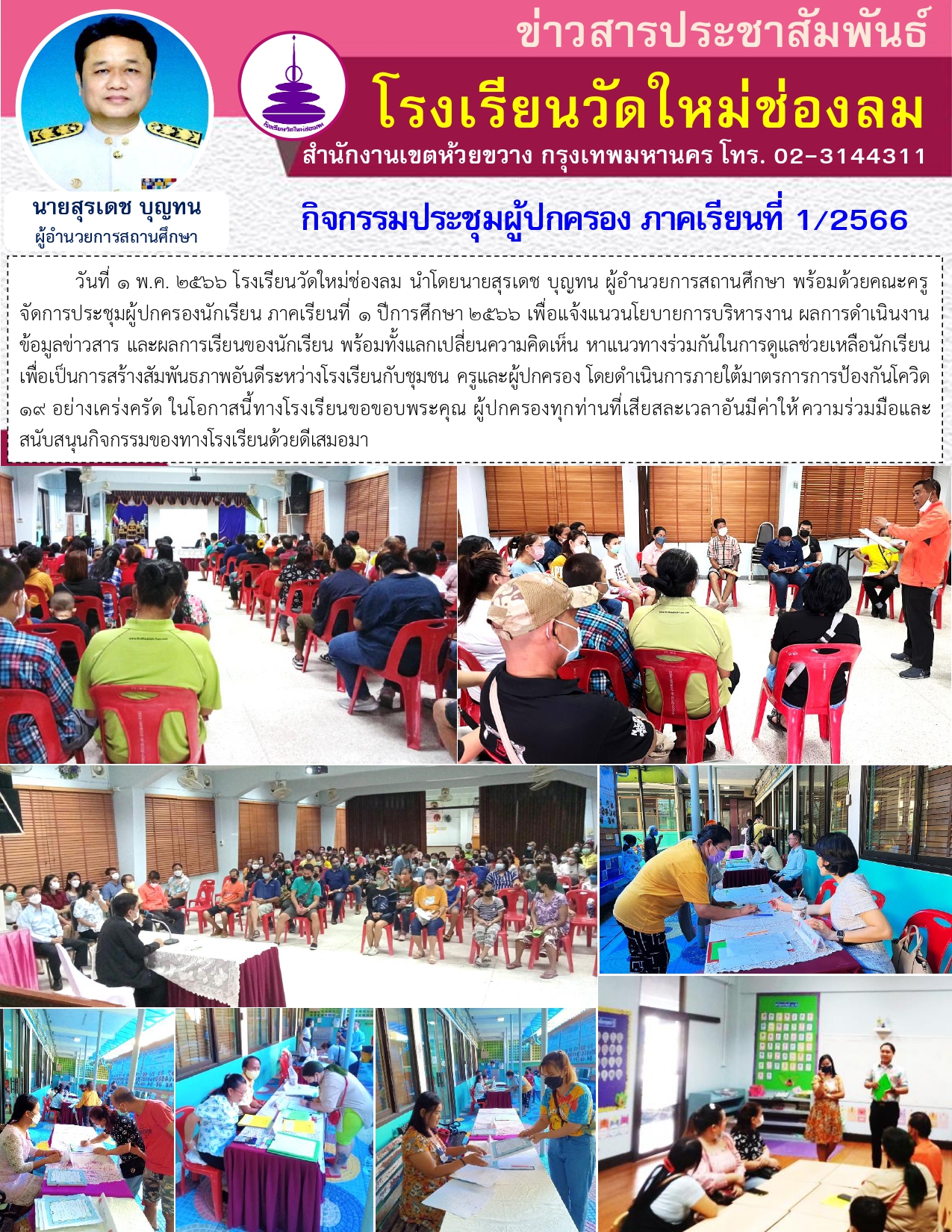 วันที่ 1 พ.ค. 2566 โรงเรียนวัดใหม่ช่องลม นำโดยนายสุรเดช บุญทน ผู้อำนวยการสถานศึกษา นายสายสิทธิ์ โถปาสอน ตำแหน่ง ครู วิทยฐานะครูชำนาญการ ผู้รับผิดชอบกิจกรรม พร้อมด้วยคณะครู จัดการประชุมผู้ปกครองนักเรียน ภาคเรียนที่ 1 ปีการศึกษา 2566 เพื่อแจ้งแนวนโยบายการบริหารงาน ผลการดำเนินงาน ข้อมูลข่าวสาร และผลการเรียนของนักเรียน พร้อมทั้งแลกเปลี่ยนความคิดเห็น หาแนวทางร่วมกันในการดูแลช่วยเหลือนักเรียน เพื่อเป็นการสร้างสัมพันธภาพอันดีระหว่างโรงเรียนกับชุมชน ครูและผู้ปกครอง โดยดำเนินการภายใต้มาตรการการป้องกันโควิด 19 อย่างเคร่งครัด ในโอกาสนี้ทางโรงเรียนขอขอบพระคุณ ผู้ปกครองทุกท่านที่เสียสละเวลาอันมีค่าให้ความร่วมมือและสนับสนุนกิจกรรมของทางโรงเรียนด้วยดีเสมอมา