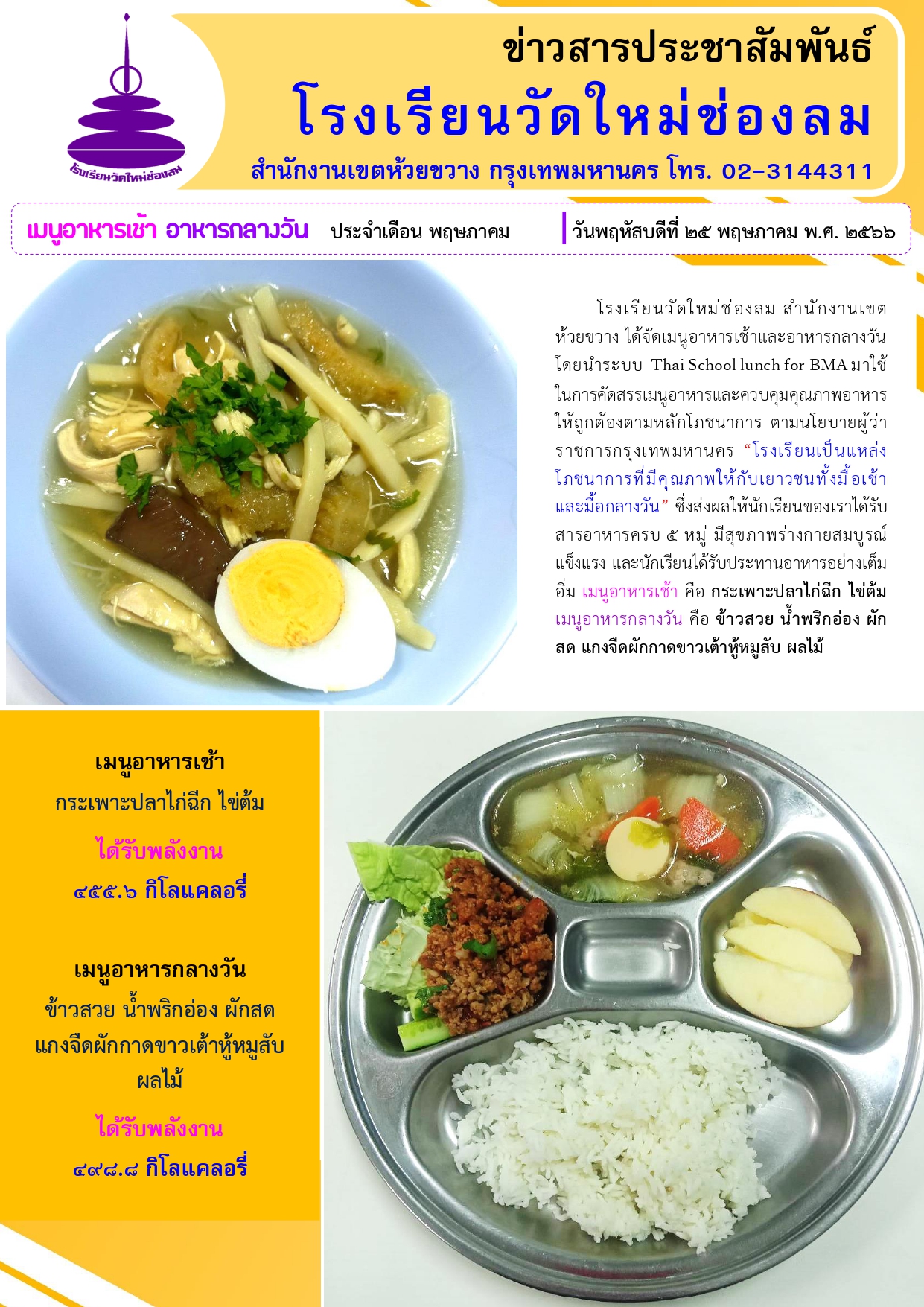 อาหารเช้า อาหารกลางวัน สำหรับนักเรียนโรงเรียนวัดใหม่ช่องลม ประจำวันที่ 25 พฤษภาคม 2566