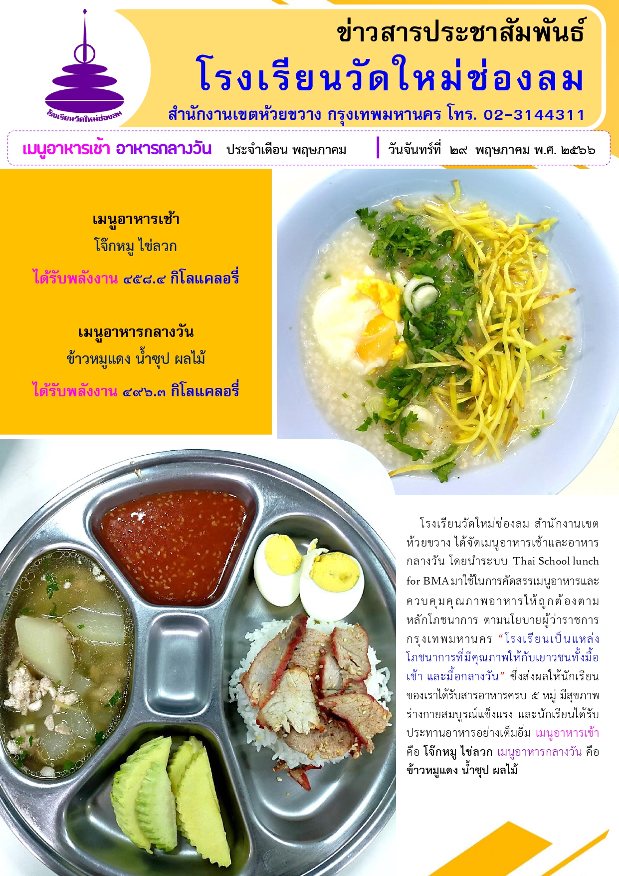 อาหารเช้า อาหารกลางวัน สำหรับนักเรียนโรงเรียนวัดใหม่ช่องลม ประจำวันที่ 29 พฤษภาคม 2566