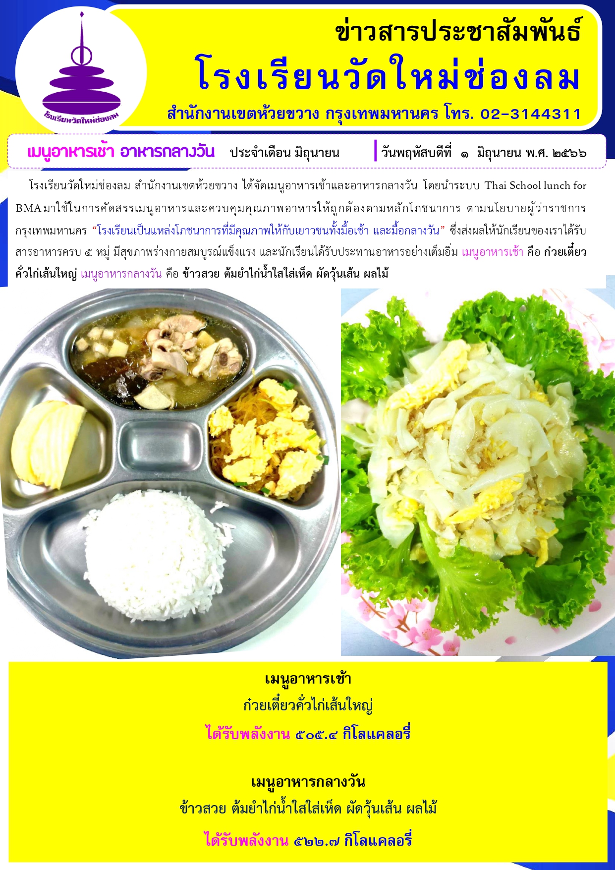 อาหารเช้า อาหารกลางวัน สำหรับนักเรียนโรงเรียนวัดใหม่ช่องลม ประจำวันที่ 1 มิถุนายน 2566