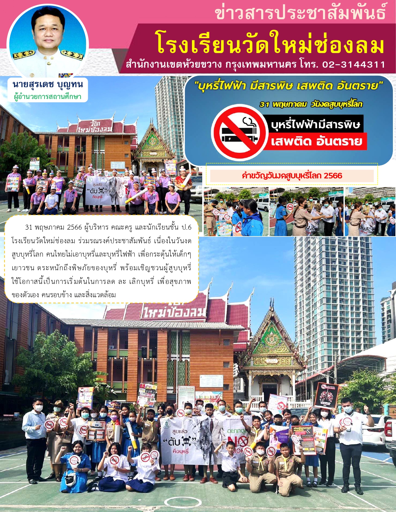 เมื่อวันที่ 31 พฤษภาคม 2566 ผู้บริหาร คณะครู และนักเรียนชั้น ป.6 โรงเรียนวัดใหม่ช่องลม ร่วมรณรงค์ประชาสัมพันธ์ เนื่องในวันงดสูบบุหรี่โลก คนไทยไม่เอาบุหรี่และบุหรี่ไฟฟ้า เพื่อกระตุ้นให้เด็กๆเยาวชน ตระหนักถึงพิษภัยของบุหรี่ พร้อมเชิญชวนผู้สูบบุหรี่ ใช้โอกาสนี้เป็นการเริ่มต้นในการลด ละ เลิกบุหรี่ เพื่อสุขภาพของตัวเอง คนรอบข้าง และสิ่งแวดล้อม