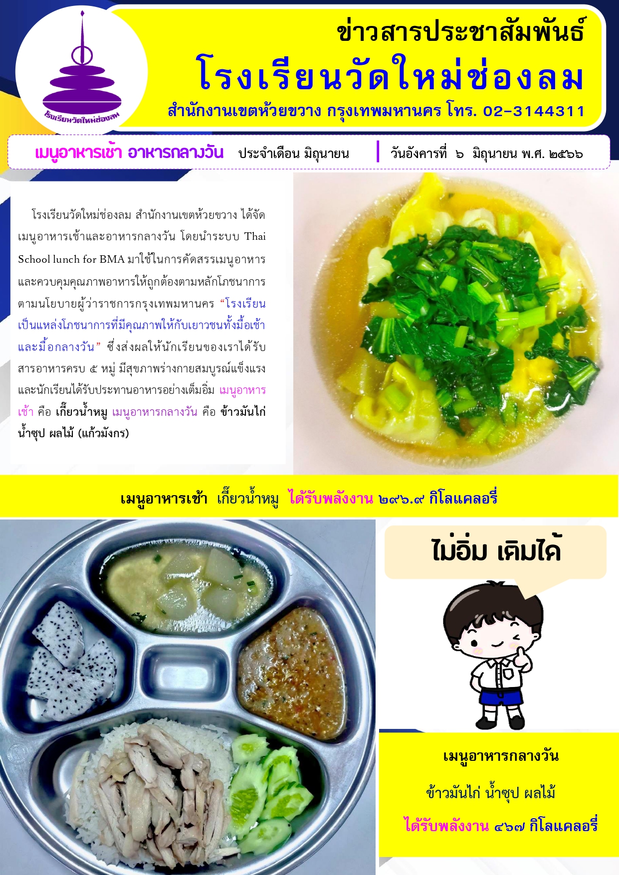 อาหารเช้า อาหารกลางวัน สำหรับนักเรียนโรงเรียนวัดใหม่ช่องลม ประจำวันที่ 6 มิถุนายน 2566