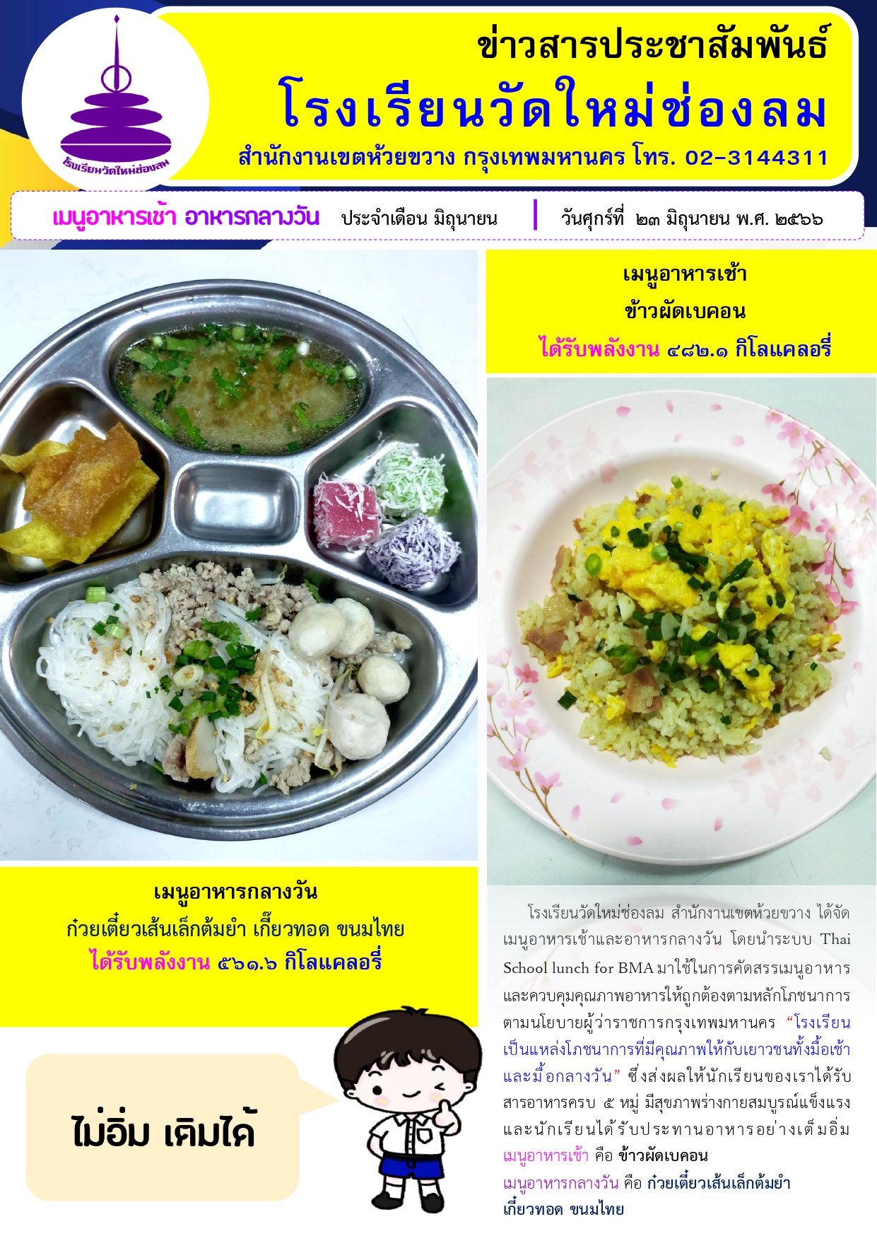 อาหารเช้า อาหารกลางวัน สำหรับนักเรียนโรงเรียนวัดใหม่ช่องลม ประจำวันศุกร์ที่ 23 มิถุนายน 2566