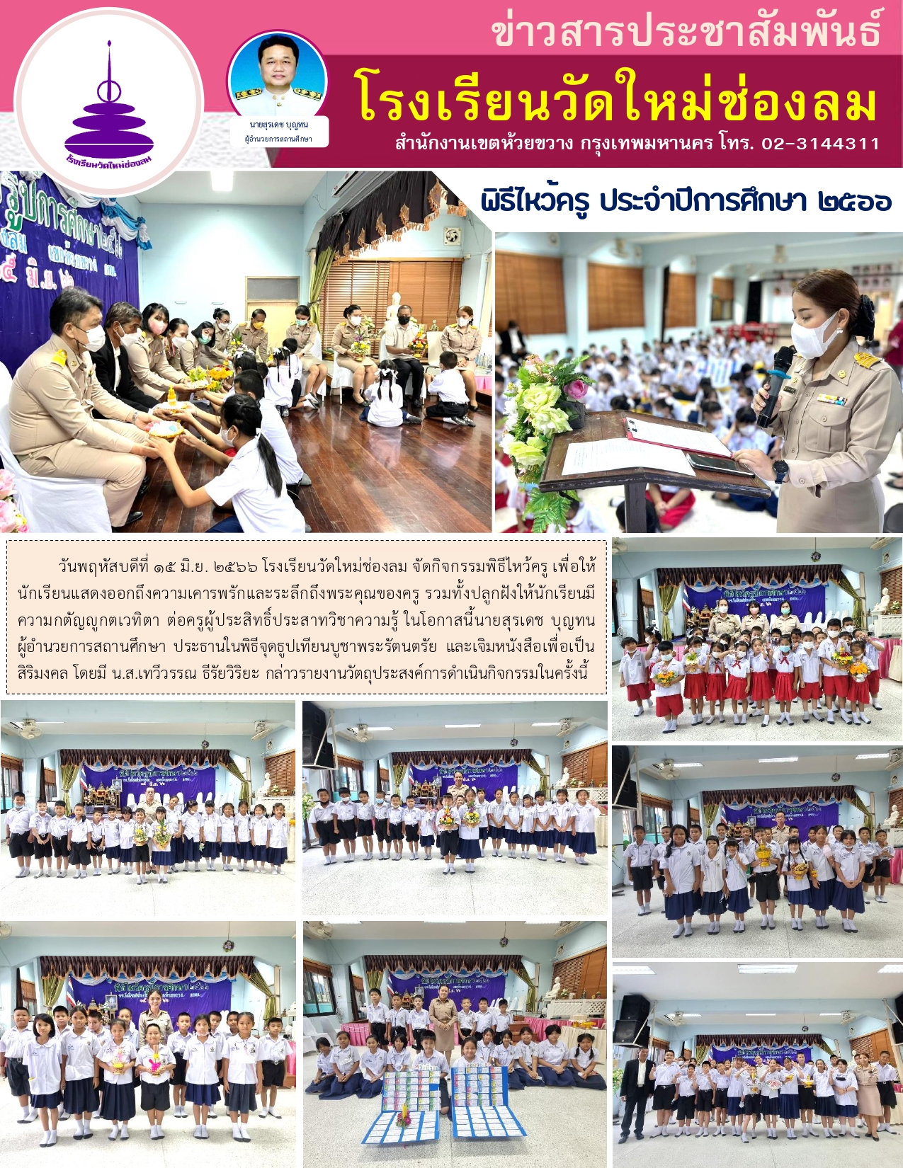 เมื่อวันพฤหัสบดีที่ 15 มิ.ย. 2566 โรงเรียนวัดใหม่ช่องลม จัดกิจกรรมไหว้ครู เพื่อให้นักเรียนแสดงออกถึงความเคารพรักและระลึกถึงพระคุณของครู รวมทั้งปลูกฝังให้นักเรียนมีความกตัญญูกตเวทิตา ต่อครูผู้ประสิทธิ์ประสาทวิชาความรู้ ในโอกาสนี้นายสุรเดช บุญทน ผู้อำนวยการสถานศึกษา ประธานในพิธีจุดธูปเทียนบูชาพระรัตนตรัย และเจิมหนังสือเพื่อเป็นสิริมงคล โดยมี น.ส.เทวีวรรณ ธีรัยวิริยะ กล่าวรายงานวัตถุประสงค์การดำเนินกิจกรรมในครั้งนี้