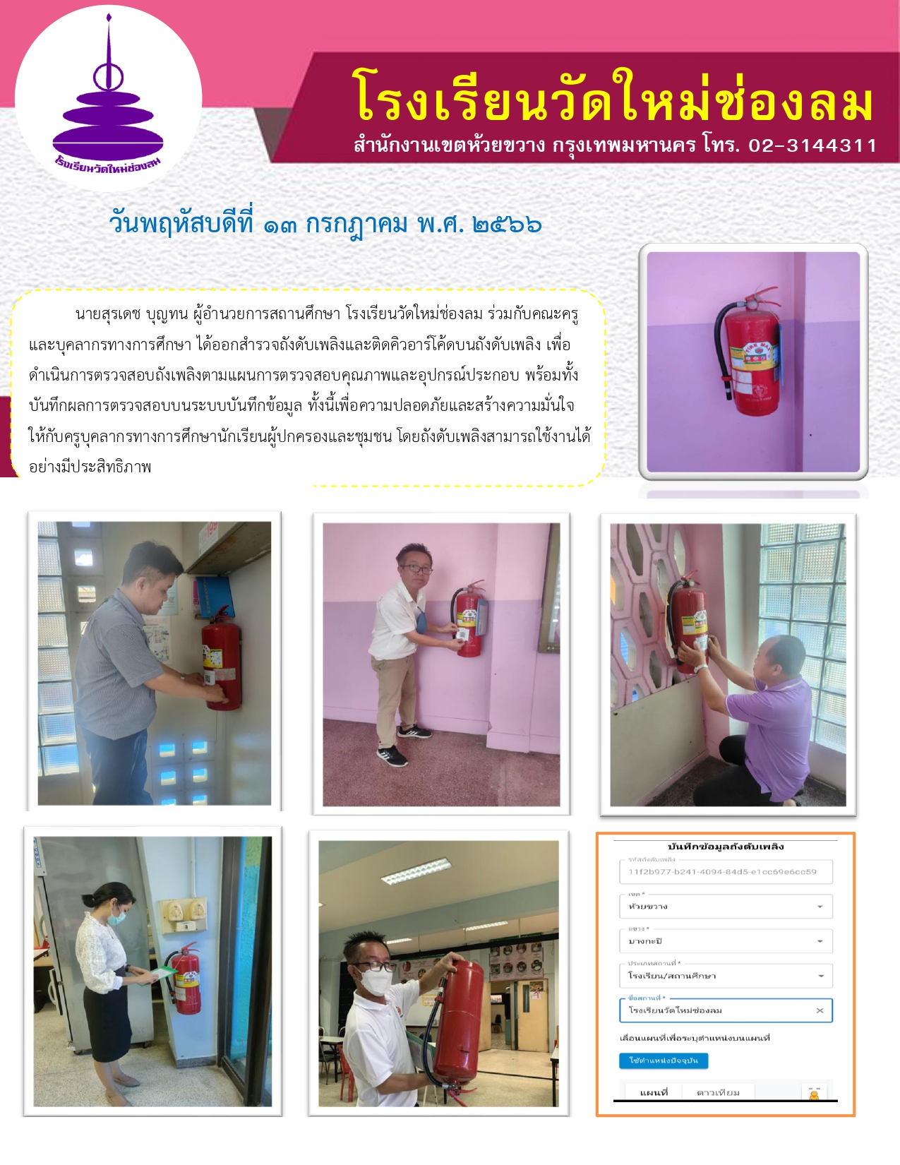 โรงเรียนวัดใหม่ช่องลม มีถังดับเพลิงทั้งหมด 9 ถัง ได้ดำเนินการตรวจสอบคุณภาพของถังดับเพลิงพร้อมอุปกรณ์ต่างๆ ตามแนวทางการตรวจสอบที่สำนักงานป้องกันและบรรเทาสาธารณภัยกำหนด