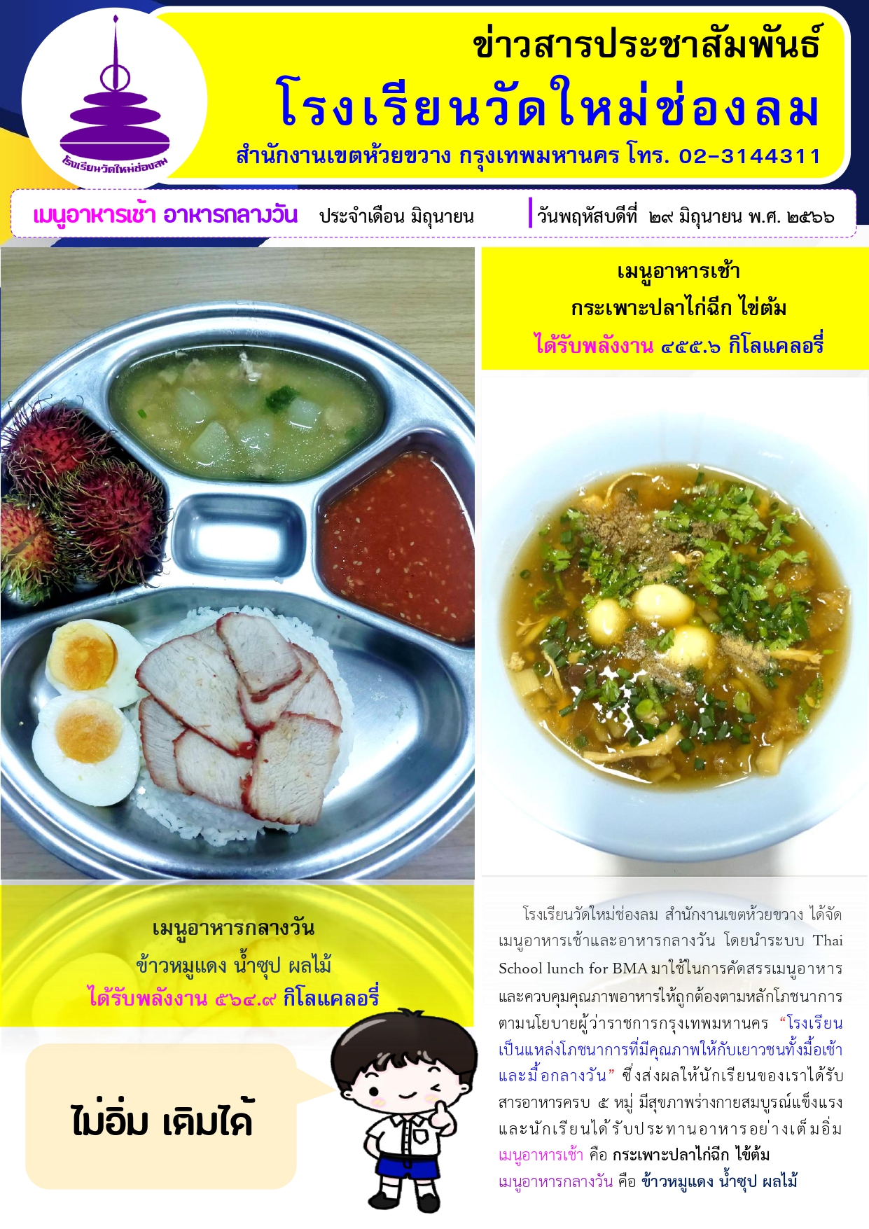 อาหารเช้า อาหารกลางวัน สำหรับนักเรียนโรงเรียนวัดใหม่ช่องลม ประจำวันพฤหัสบดีที่ 29 มิถุนายน 2566
