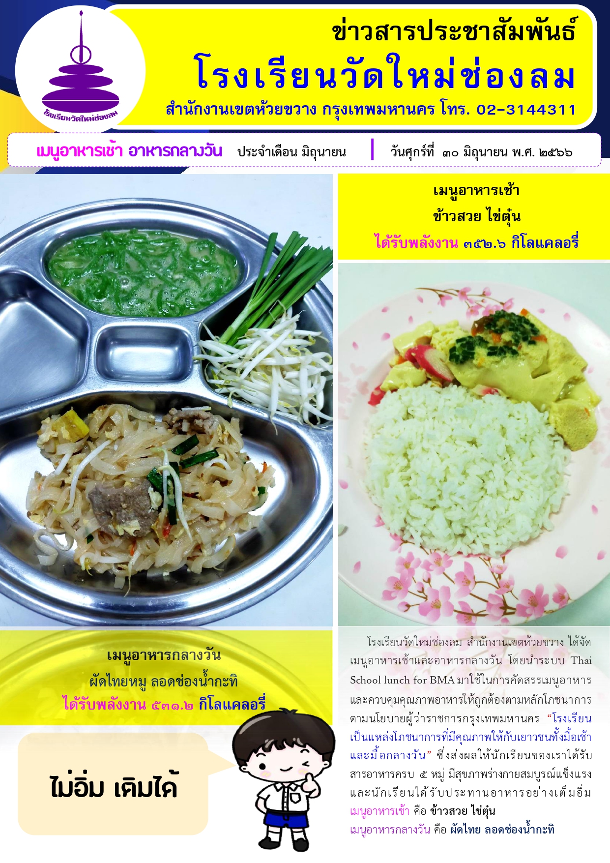 อาหารเช้า อาหารกลางวัน สำหรับนักเรียนโรงเรียนวัดใหม่ช่องลม ประจำวันศุกร์ที่ 30 มิถุนายน 2566