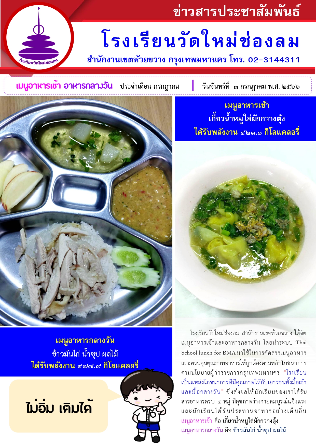 อาหารเช้า อาหารกลางวัน สำหรับนักเรียนโรงเรียนวัดใหม่ช่องลม ประจำวันจันทร์ที่ 3 กรกฎาคม 2566