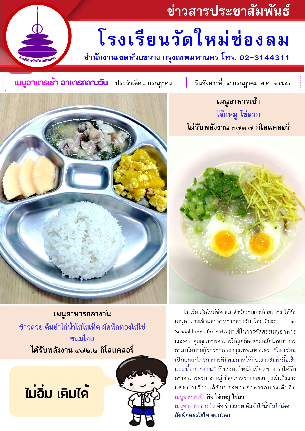 อาหารเช้า อาหารกลางวัน สำหรับนักเรียนโรงเรียนวัดใหม่ช่องลม ประจำวันอังคารที่ 4 กรกฎาคม 2566