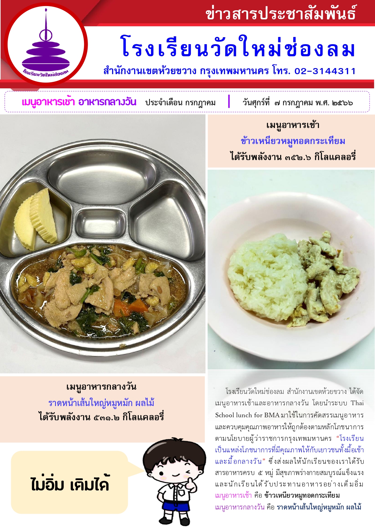 อาหารเช้า อาหารกลางวัน สำหรับนักเรียนโรงเรียนวัดใหม่ช่องลม ประจำวันศุกร์ที่ 7 กรกฎาคม 2566