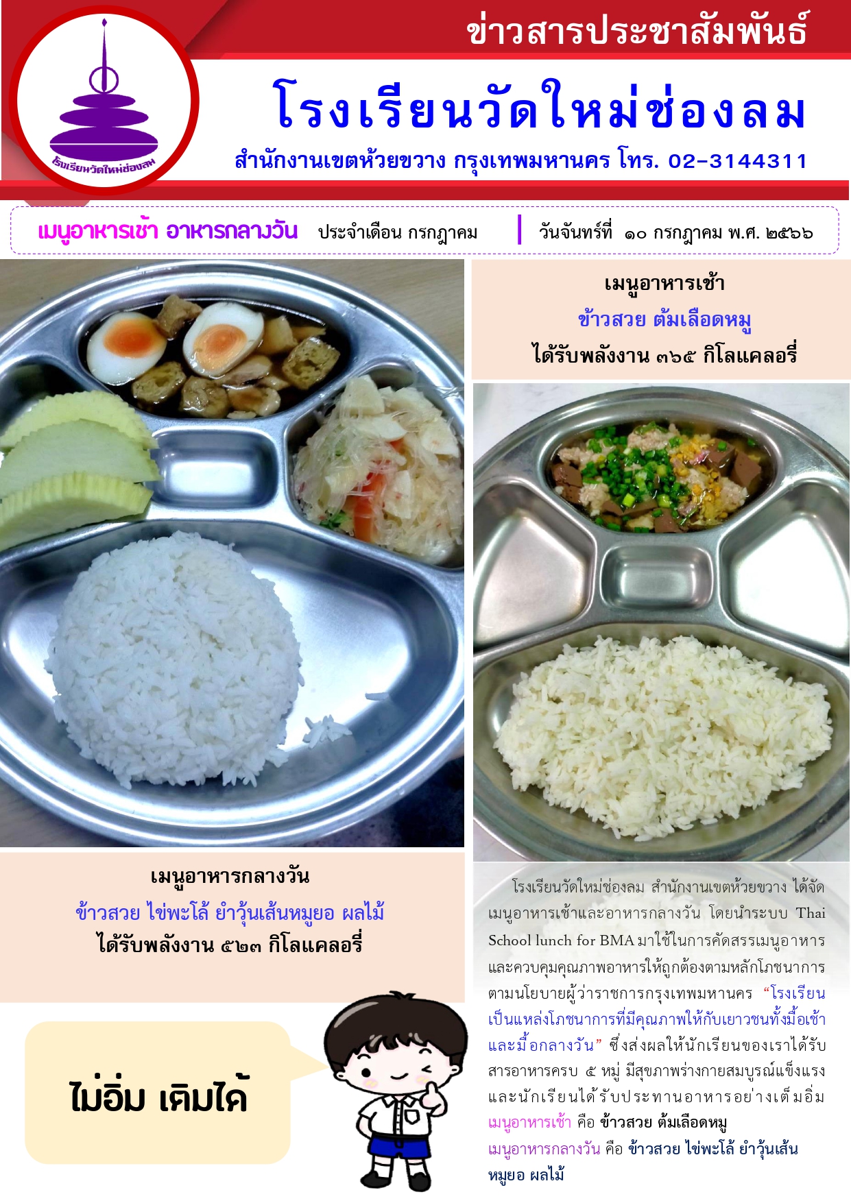 อาหารเช้า อาหารกลางวัน สำหรับนักเรียนโรงเรียนวัดใหม่ช่องลม ประจำวันจันทร์ที่ 10 กรกฎาคม 2566
