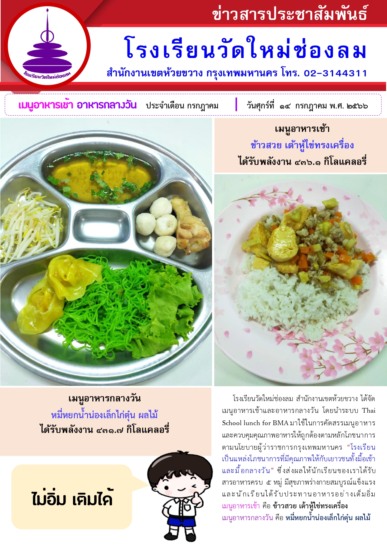 อาหารเช้า อาหารกลางวัน สำหรับนักเรียนโรงเรียนวัดใหม่ช่องลม ประจำวันศุกร์ที่ 14 กรกฎาคม 2566