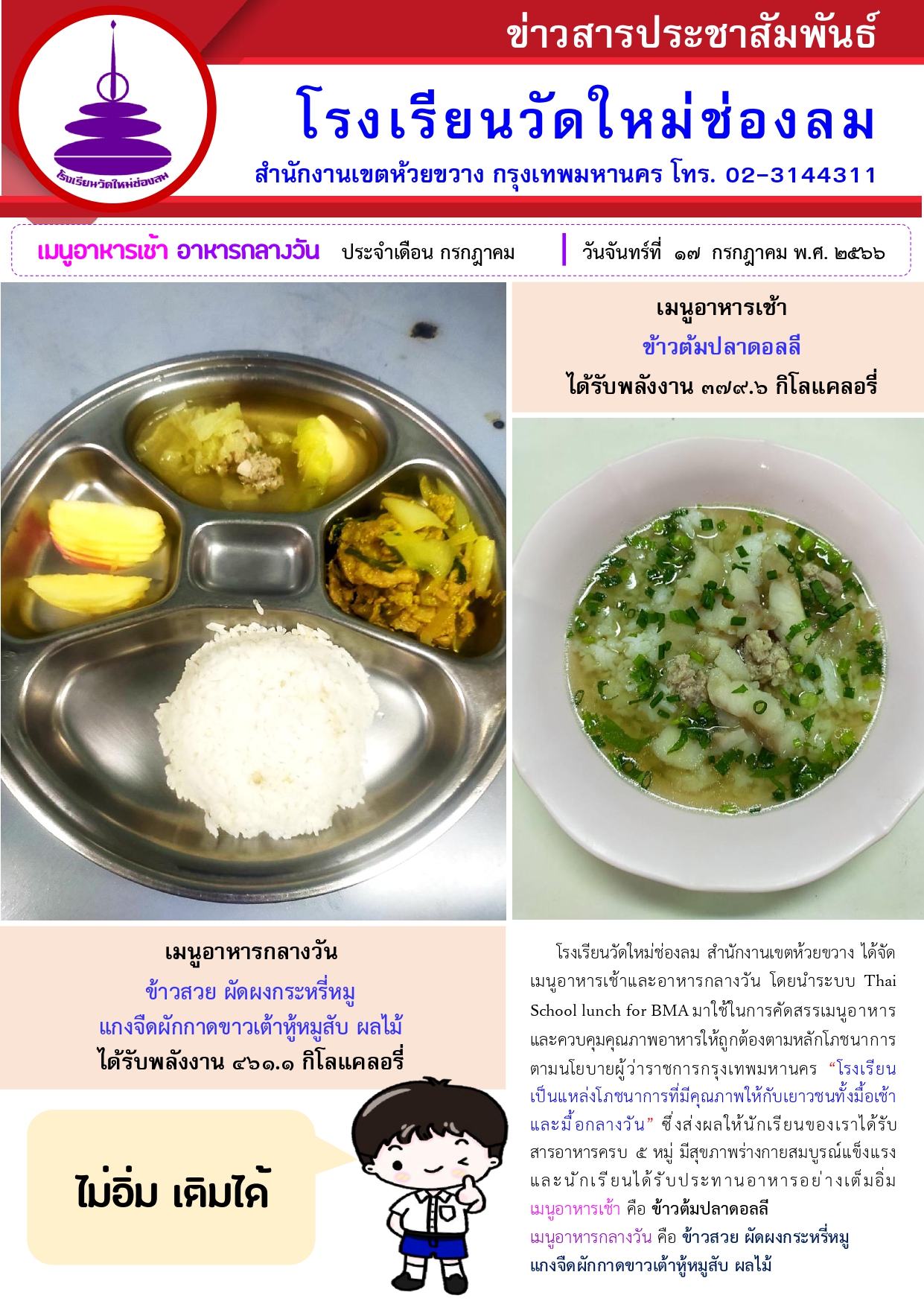 อาหารเช้า อาหารกลางวัน สำหรับนักเรียนโรงเรียนวัดใหม่ช่องลม ประจำวันจันทร์ที่ 17 กรกฎาคม 2566
